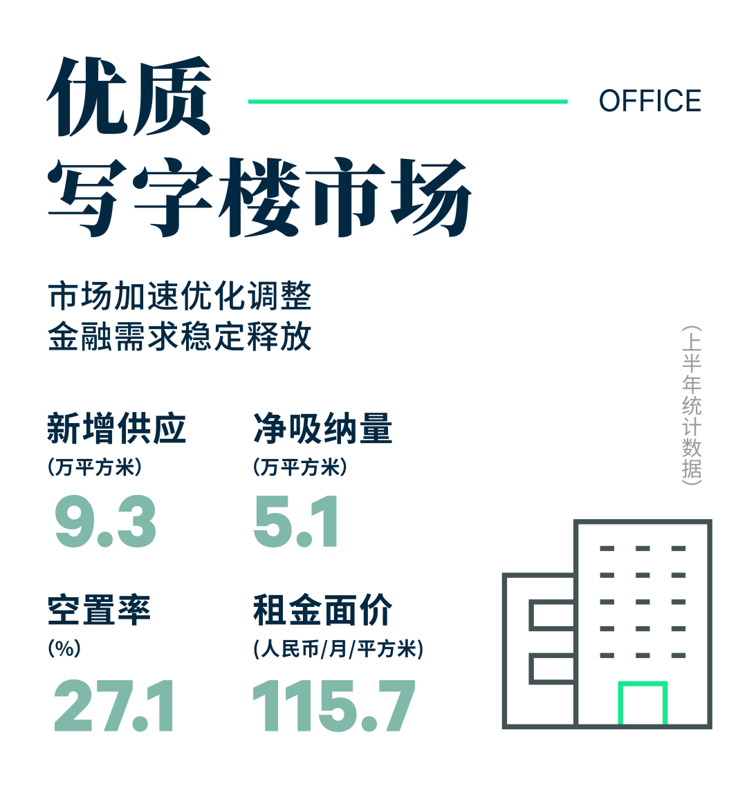 企业秉承降本增效的经营策略致整合搬迁态势活跃,推动搬迁需求仍为上半年成交类型之主导。新设需求增幅有限,市场去化压力随之增大,业主采取更为灵活激进的租赁策略加以应对,致各板块租金报价出现不同幅度下探,全市平均租金环比下降0.5%,较去年年底下降0.8%至每月每平方米115.7元。