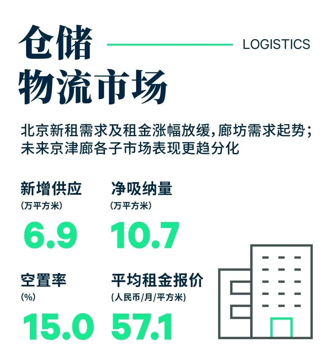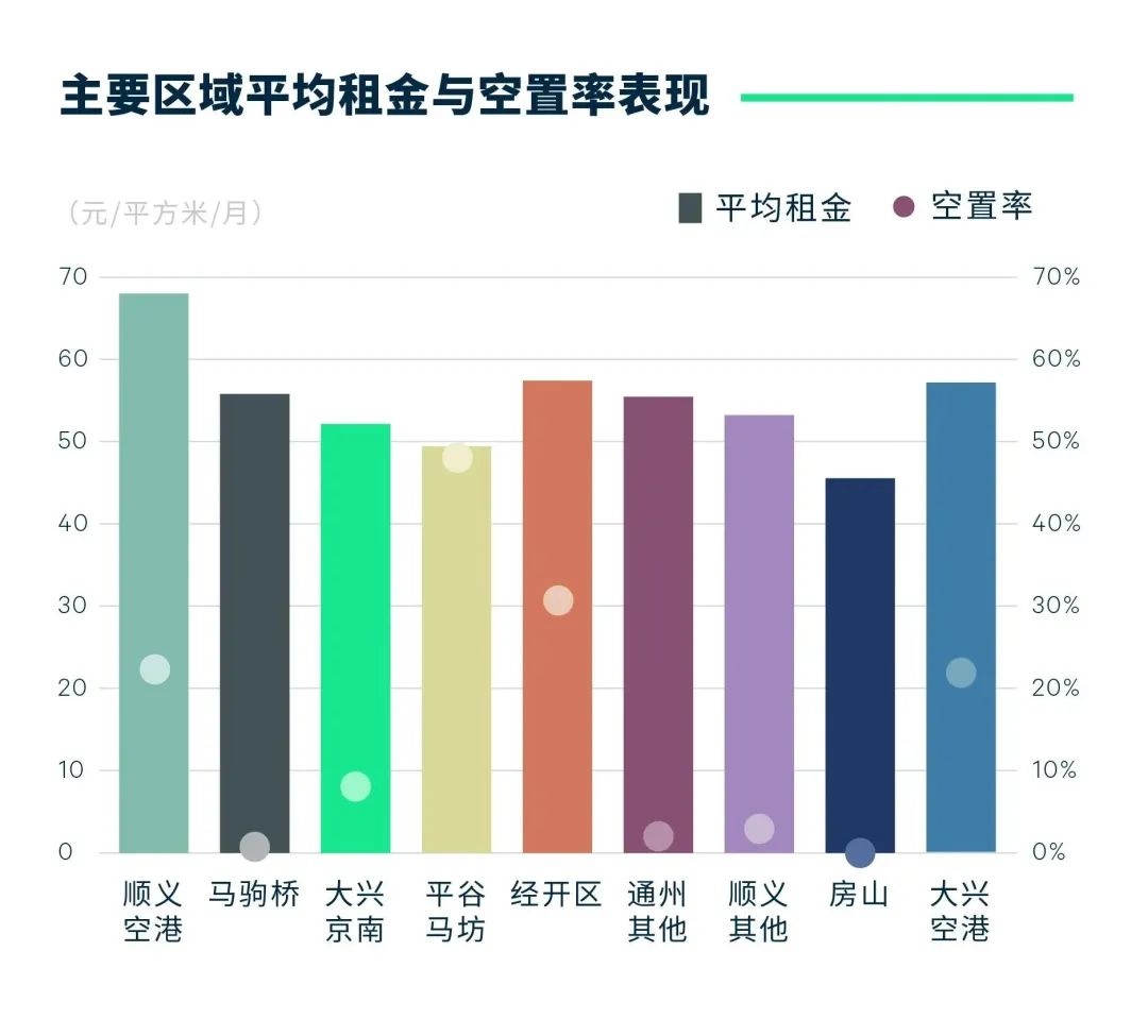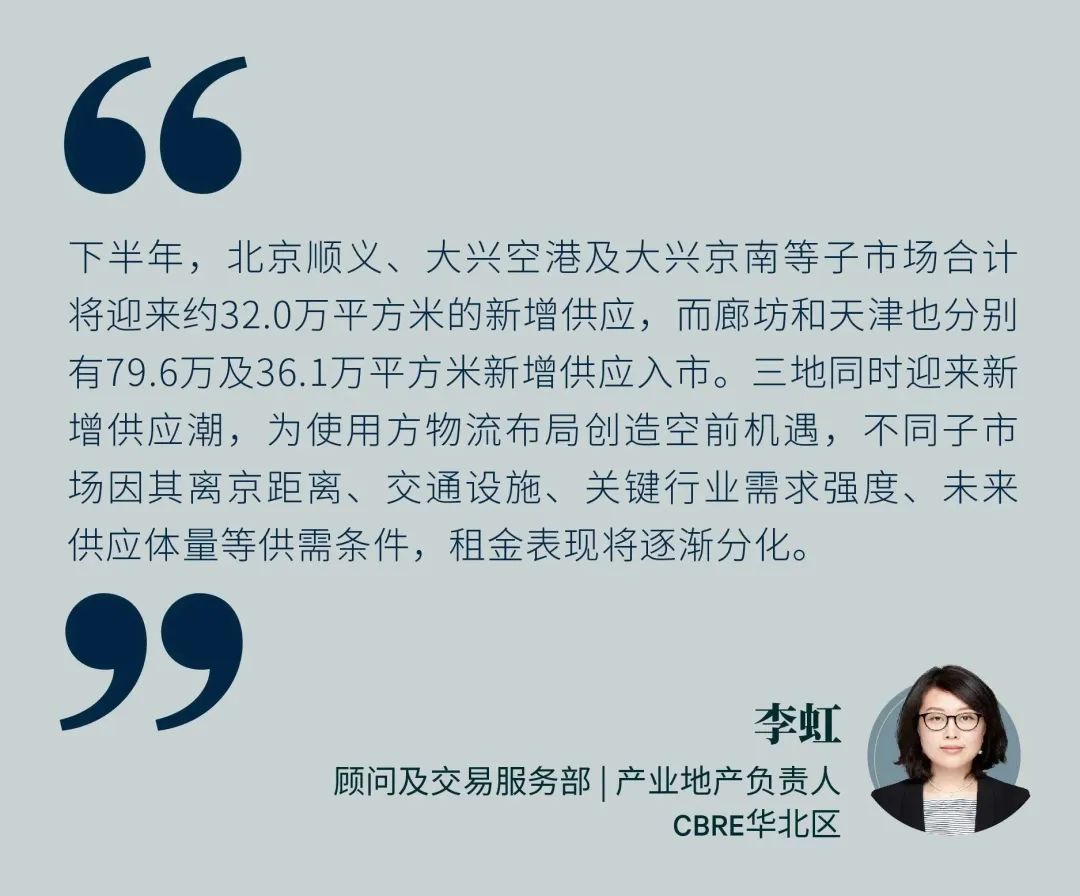 廊坊临空经济区入市10.2万平方米的高标仓储项目。受益于北京需求外溢,恰逢各大头部电商企业及第三方物流备战年中大促,季内全市净吸纳爆发式增长至34.6万平方米。第三方物流占据总新租交易面积的54%,电商类占38%居次,外加小部分汽配及家居制造业需求。季末全市空置率环比大幅回落9.5个百分点至50.2%,以北三县、安次及新兴子市场临空经济区表现最为活跃。