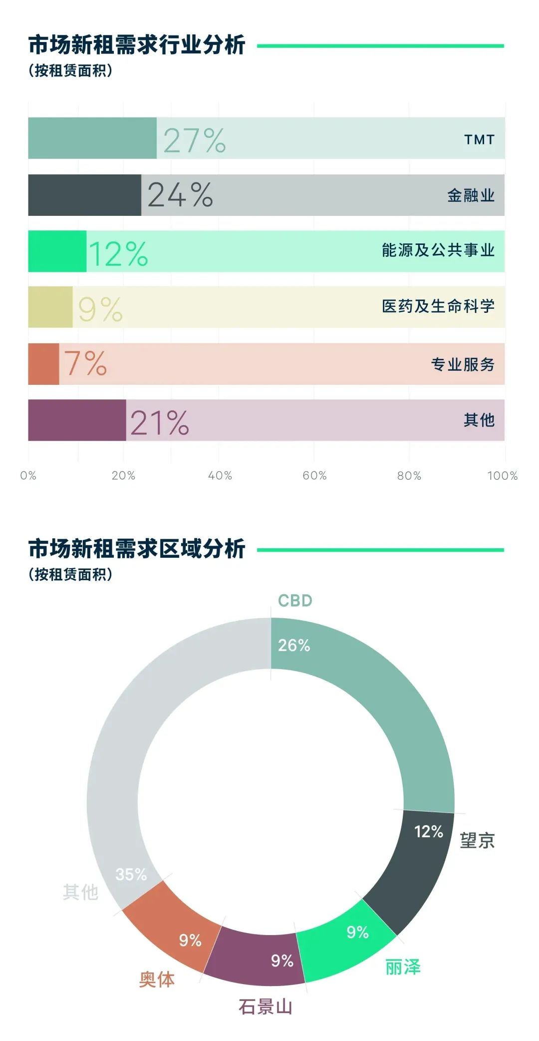 市场问询量和带看量经历了一季度的集中释放后,本季度回落至常态水平。伴随前期启动交易的陆续落地,本季新租交易面积总量环比上升26%,但仍低于2022年的季度均值。市场近六成新租交易来自搬迁需求,扩租数量环比小幅增加。软件开发和电信通讯等赛道均有不错表现,TMT板块新租需求释放。金融行业季内环比交易数量增加但交易面积缩减,其中证券租户的扩租活动增多,保险租户活动以区位和楼宇升级为主。新能源、基建类国有企业的升级搬迁及扩租活动表现持续向好。其他行业中,医药及生命科学保持稳健;在疫情后需求恢复、土地供应释放等利好因素下,消费服务类、房地产建筑扩租开始活跃。