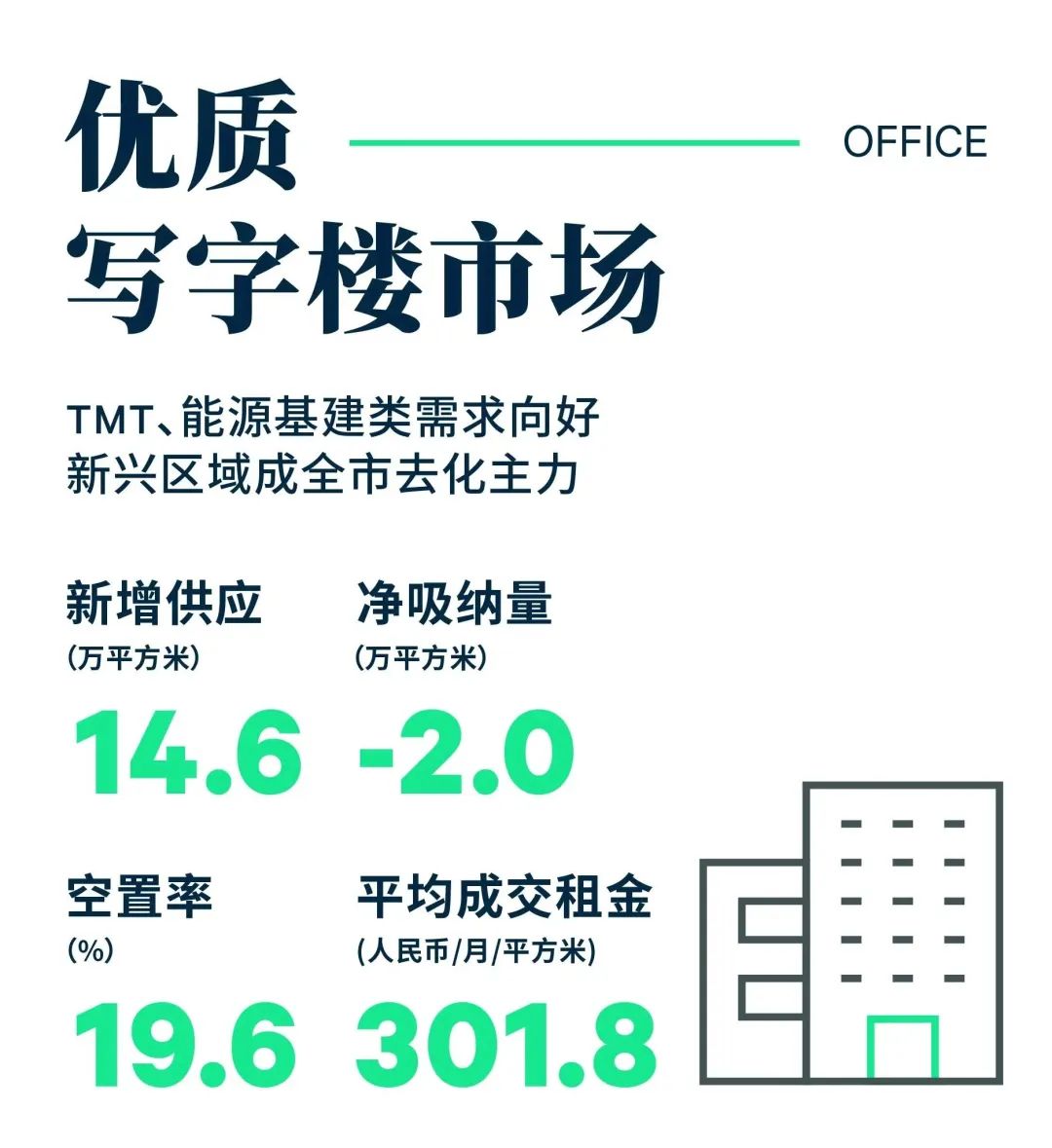2023年第二季度,位于通州区域的三个新项目交付使用,新增写字楼租赁面积14.6万平方米,上半年新增供应共完成全年总量的1/5。新项目未有租户入驻,全市空置率因而环比上涨0.5个百分点至19.6%。