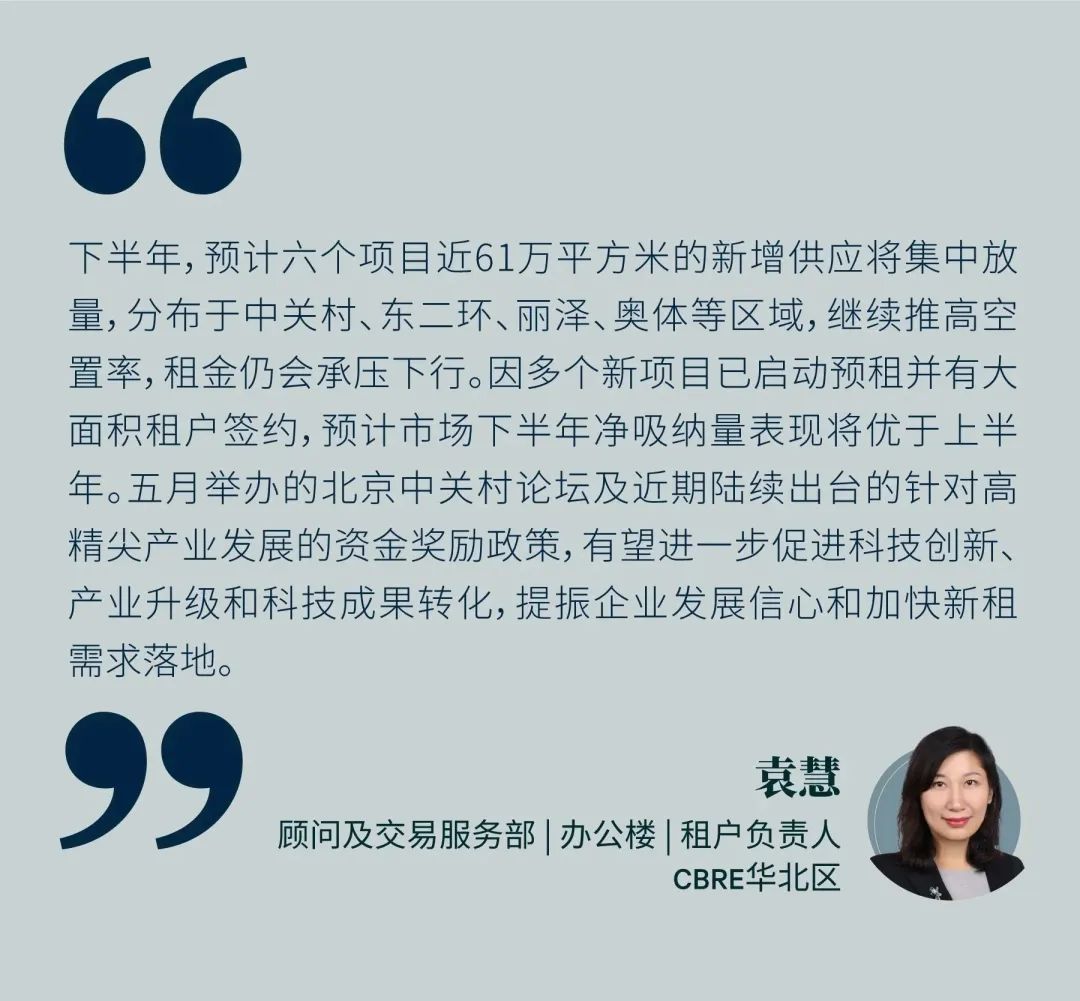 全市空置率环比上升0.2个百分点至20.1%。从细分子市场来看,中关村软件园在TMT企业扩租以及周边老旧楼宇租户升级搬迁需求的带动下,本季度净吸纳量自2022年以来首次转正,空置率环比下降3.0个百分点至22.5%,但在紧邻的上地子市场,中小科技企业的腾退现象还在继续,使得空置率持续攀升并首次突破20%。电子城是另一个受TMT企业退租影响的子市场,叠加新租需求持续低迷,连续第五个季度录得负吸纳。而多元化产业发展的经开区以及国企聚集的丰台科技园子市场,上半年保持韧性,承接生命科学,航空航天,轨道交通和硬件科技等产业新增需求,经开区空置率降至20.6%,而丰台科技园空置率更是降至历史最低的8.3%。