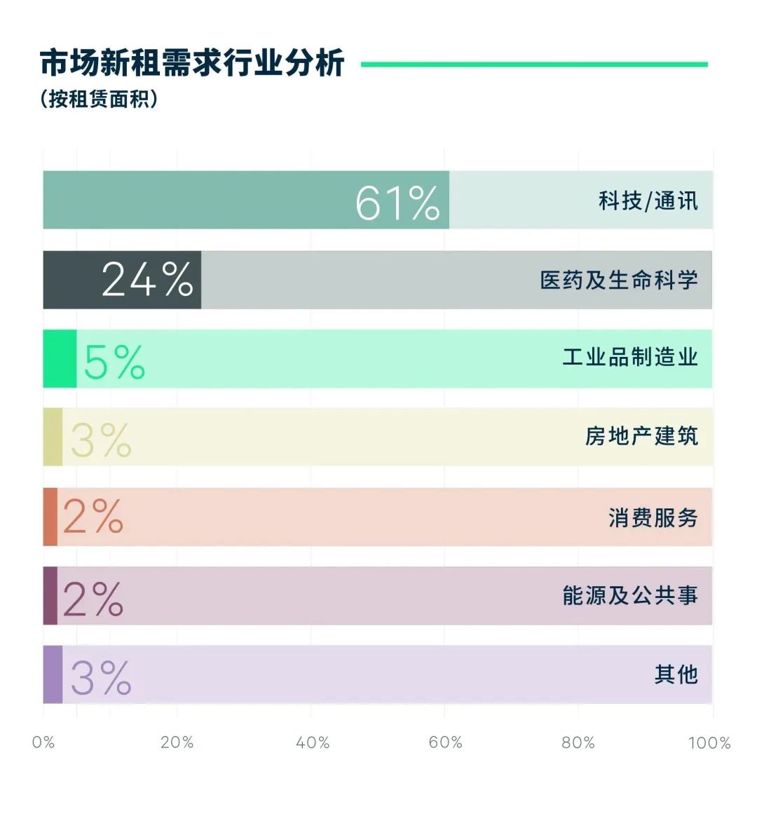 本季度全市净吸纳量录得2.2万平方米,其中既有项目净吸纳量由负转正,但上半年净吸纳量仍不及去年同期。互联网头部企业大面积腾退现象明显缓和,TMT新租需求超过医药及生命科学成为季内市场主力,录得占比超70%,其中围绕互联网教育或云计算相关的科技企业开始释放扩租或升级搬迁需求。医药及生命科学以及航空航天,装备制造等工业品制造类亦有表现。