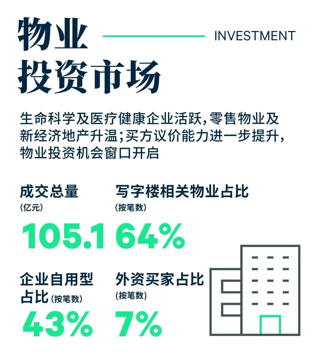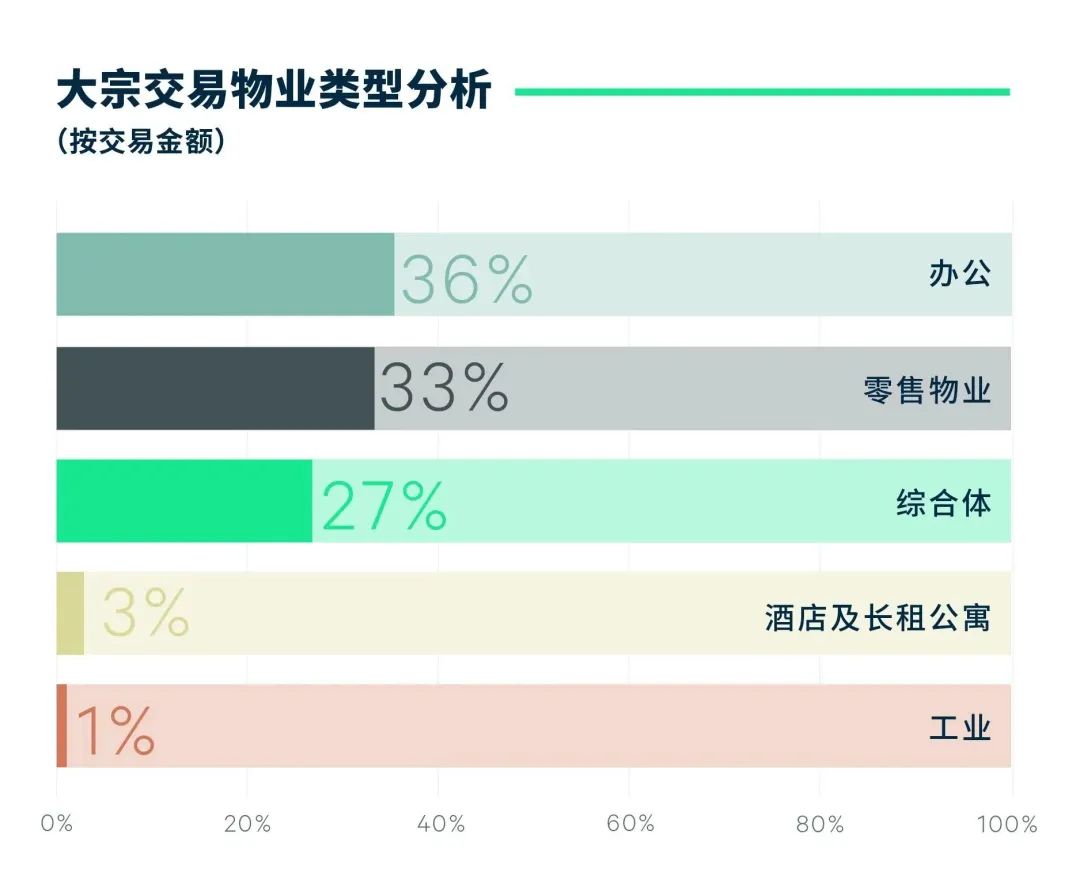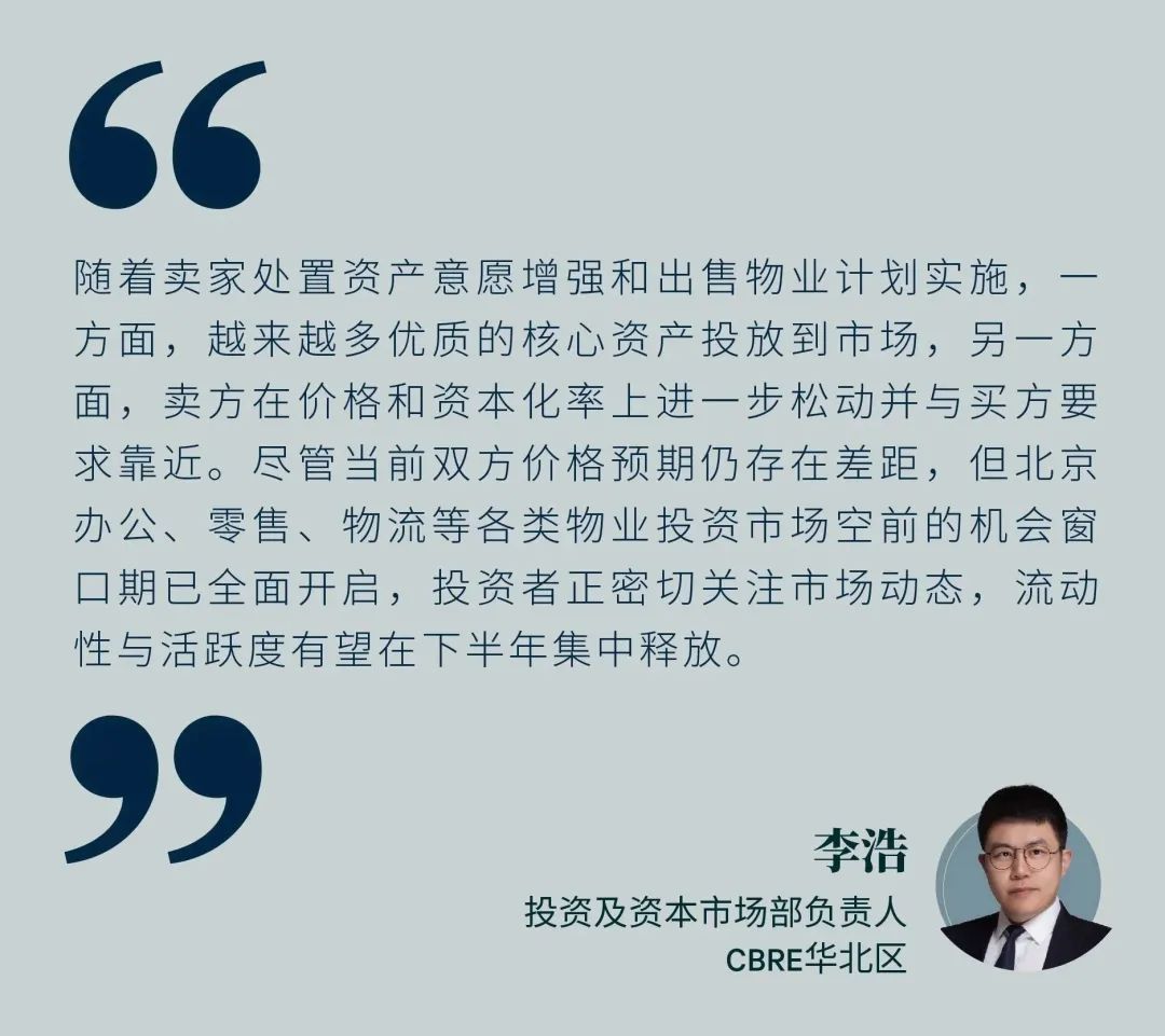 上半年近一半的交易笔数来自企业购置楼宇自用的需求,本季度生命科学及医疗健康类企业表现尤其活跃,分别完成位于经开区和东升的研发办公,以及位于望京区域的购物中心共三宗交易。中资地产基金亦有表现,购入CBD区域一座成熟且收益稳定的长租公寓。从投资物业类型来看,近期公募REIT扩容并将“消费基础设施”纳入底层资产范围,在此背景下,本季度零售物业交易占比高达65%,其中包括季内最大成交,即居然之家以19.63亿元的对价完成对亚奥商圈的朝阳远洋未来广场的收购,使得零售物业成为除办公外上半年最受欢迎的板块。此外,以产业园区、工业物流、长租公寓、生命科学地产为代表的新经济板块均有贡献成交。随着 “新经济地产”运营管理模式、通过REIT募资和退出模式逐步成熟,投资者对未来成本、收益及价值评估方式逐渐清晰并形成共识,有助推动投资交易落地。