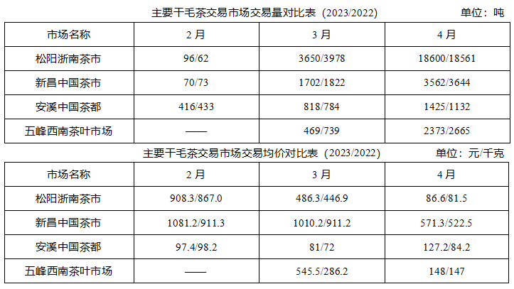 新昌中国茶市、松阳浙南茶市、安溪中国茶都、五峰西南茶市,是“中国茶业指数之地方名茶指数”的采集单位,也是最具代表性的产区市场。据各市场反馈:2023年春茶交易呈现量减价增态势。