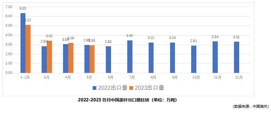中国茶叶流通协会:2023年5月中国茶叶出口情况简报 据中国海关数据,2023年5月,中国茶叶出口量为2.93万吨,同比减少1.51%,出口额为1.47亿美元,同比减少9.53%,5月出口均价为5.00美元/千克,比去年同期下降-8.14%。 截至5月,2023年中国茶叶累计出口量为14.67万吨,同比减少3.60%,累计出口额为7.08亿美元,同比减少14.28%,1-5月出口均价为美元/千克,比去年同期下降11.07%。 分茶类看。2023年1-5月,中国绿茶出口量为12.27万吨,占总出口量比重为83.7%,减少6555吨,降幅5.1%;红茶出口量为1.09万吨,占总出口量比重为7.5%,减少856吨,降幅7.3%;乌龙茶出口量为9428吨,占总出口量比重为6.4%,增加1721吨,增幅22.3%;茉莉花茶出口量为2289吨,占总出口量比重为1.6%,减少100吨,降幅4.2%;普洱茶出口量为772吨,占总出口量比重为0.5%,减少113吨,降幅12.8%;此外,其他花茶出口量为140吨,黑茶出口量为114吨,白茶出口量为259吨。 更多阅读:中国茶叶流通协会:2021年6月中国茶叶出口情况简报中国茶叶流通协会:2023年3月中国茶叶出口情况简报中国茶叶流通协会:2022年6月中国茶叶出口情况简报2022年7月中国茶叶出口情况简报2022年11月中国茶叶出口情况简报中国茶叶流通协会:2023年1-2月中国茶叶出口情况简报2022年4月中国茶叶出口情况简报中国茶叶流通协会:2022年1-2月中国茶叶出口情况简报中国茶叶流通协会:2021年中国茶叶产销形势报告——种植生产中国茶叶流通协会:中国茶叶电商发展报告(上)中国茶叶流通协会:2021年9月中国茶叶出口情况简报中国茶叶流通协会:2024年4月中国茶叶出口情况简报中国茶叶流通协会:2023年5月中国茶叶出口情况简报中国茶叶流通协会:2023 年 3 月中国茶叶出口情况简报中国茶叶流通协会:2022年中国茶叶产销形势报告