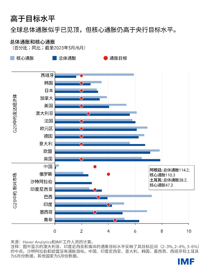 全球总体通胀似乎已经见顶,核心通胀有所缓解,这在印度尤其明显。但在大多数G20国家,特别是发达经济体,通胀仍远高于央行的目标。