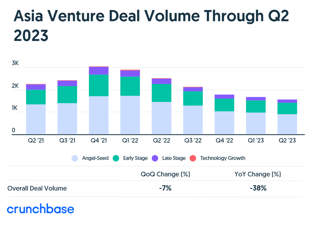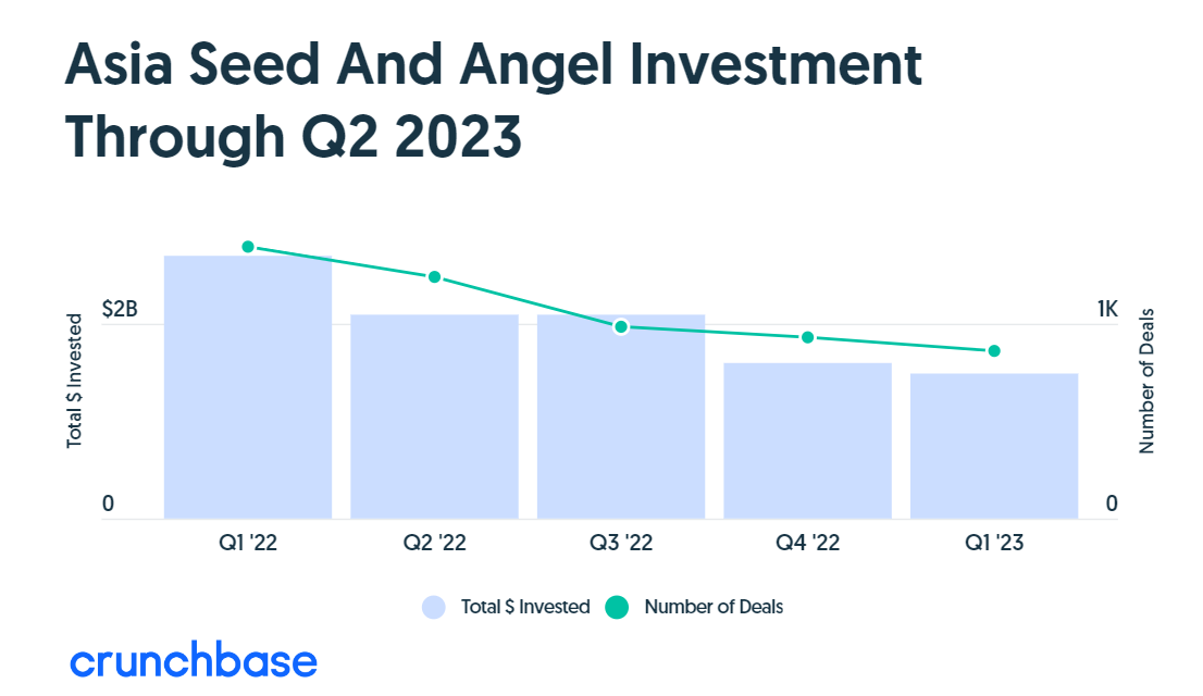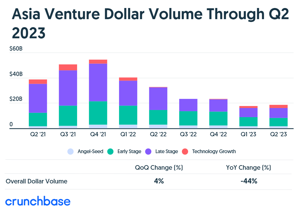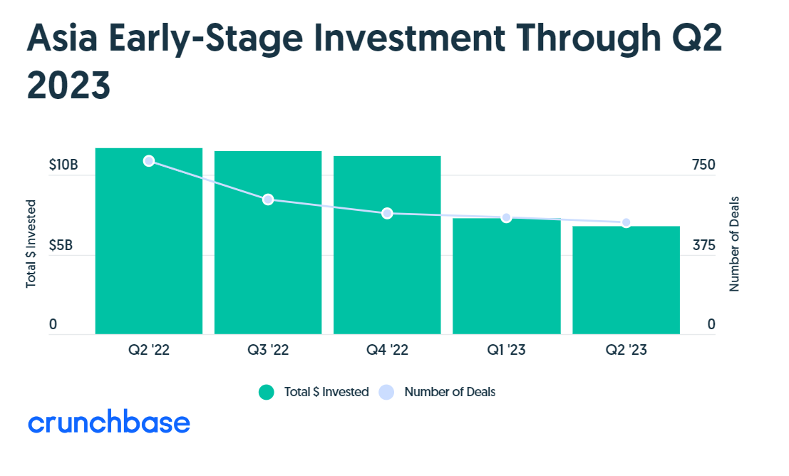 根据Crunchbase的数据,亚洲初创企业在第二季度完成529笔早期投资,投资额为68亿美元,环比下降了8%,同比下降了42%。
