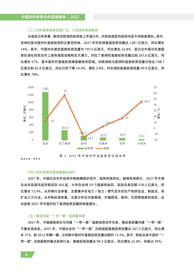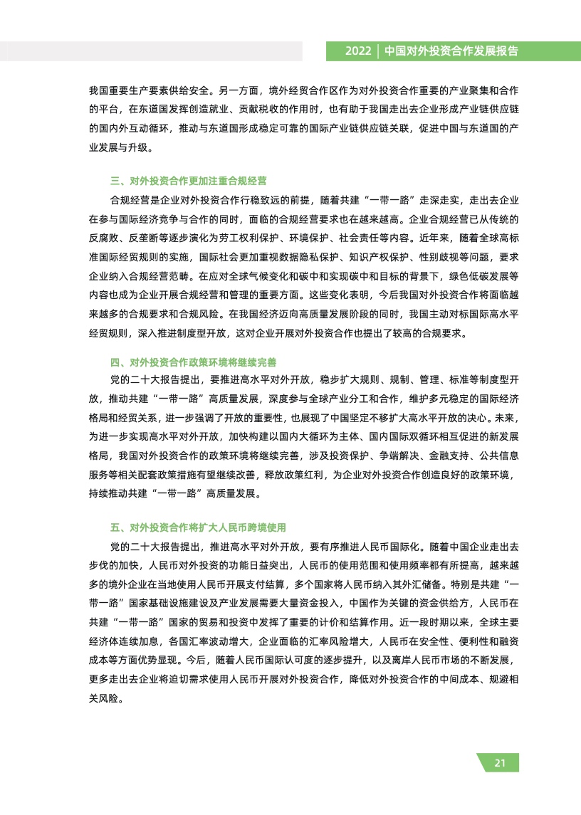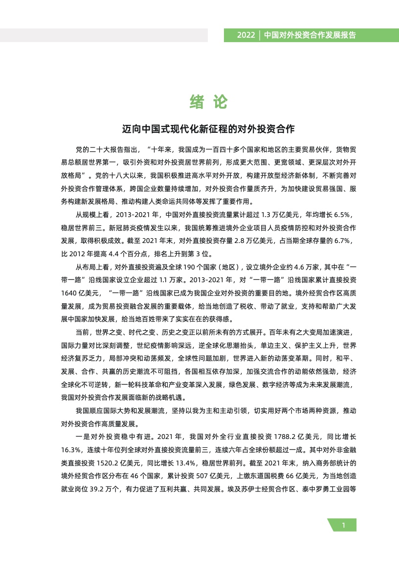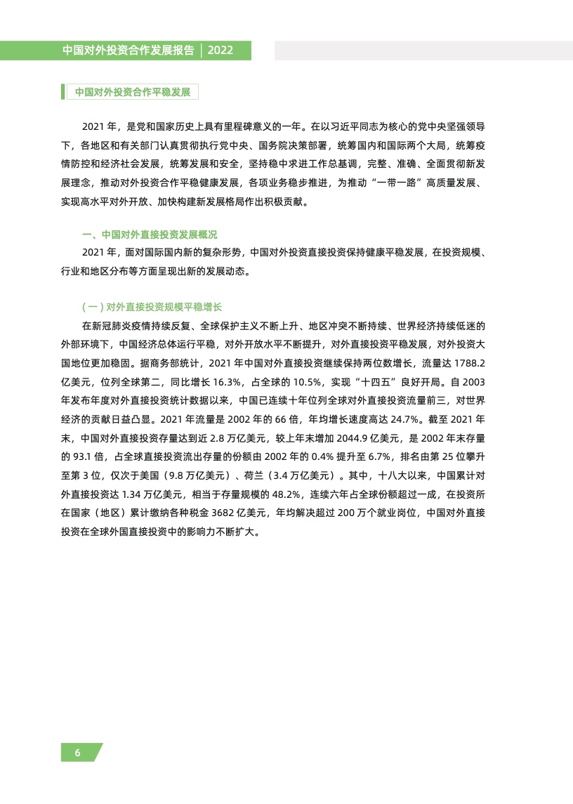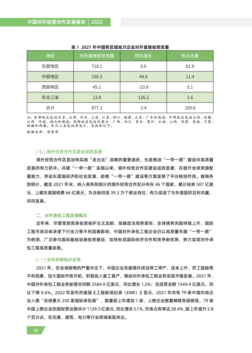 一是对外投资稳中有进。2021 年,我国对外全行业直接投资 1788.2 亿美元,同比增长 16.3%,连续十年位列全球对外直接投资流量前三,连续六年占全球份额超过一成。其中对外非金融 类直接投资 1520.2 亿美元,同比增长 13.4%,稳居世界前列。截至 2021 年末,纳入商务部统计的 境外经贸合作区分布在 46 个国家,累计投资 507 亿美元,上缴东道国税费 66 亿美元,为当地创造 就业岗位 39.2 万个,有力促进了互利共赢、共同发展。埃及苏伊士经贸合作区、泰中罗勇工业园等合作效果好、辐射效应大。
