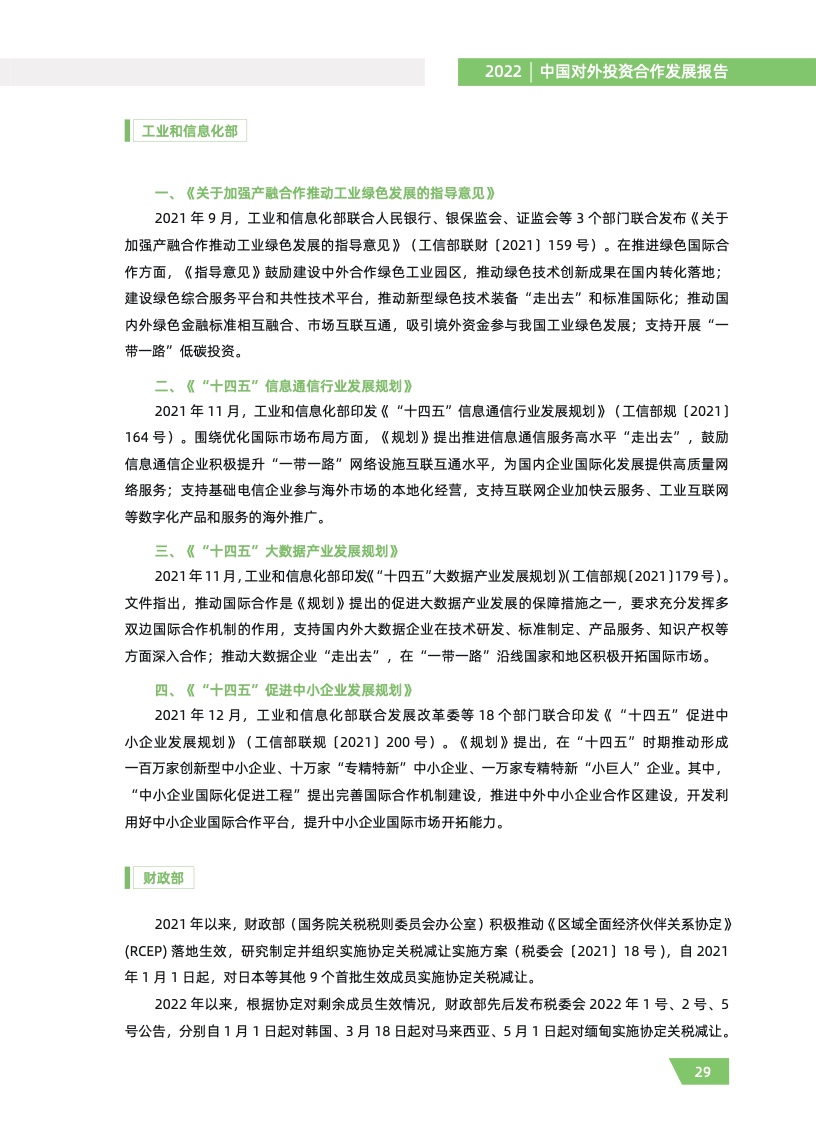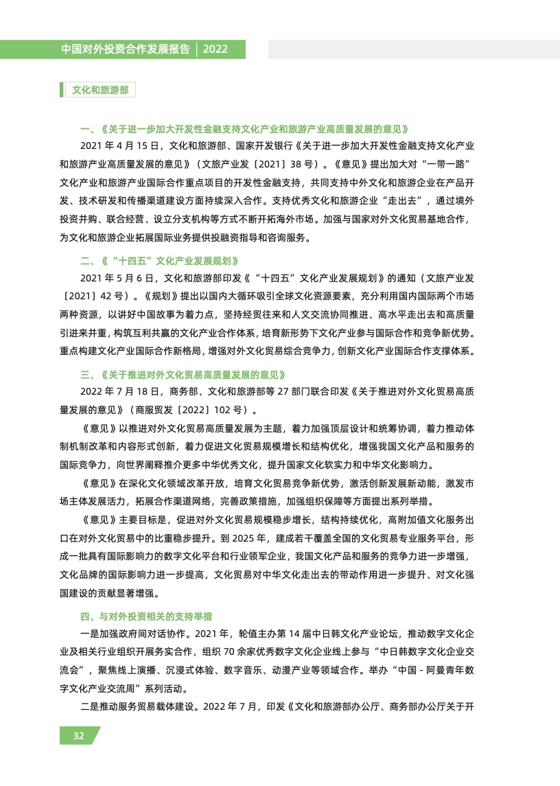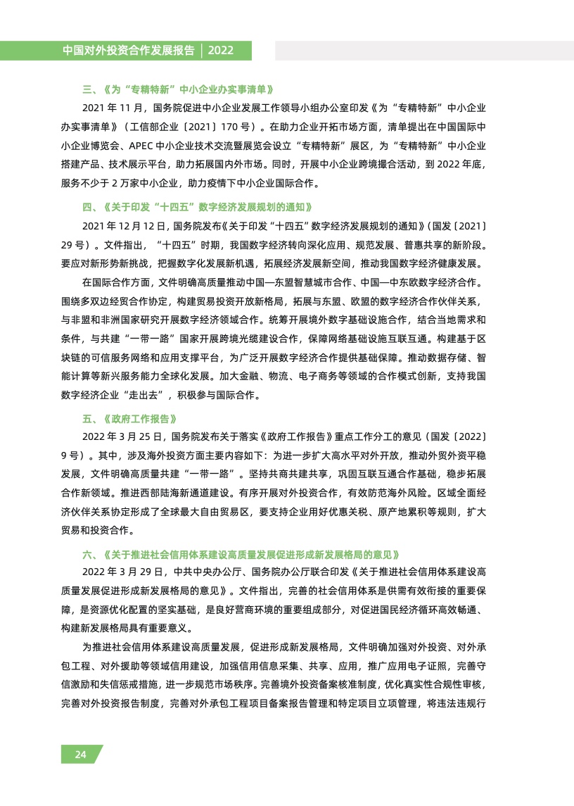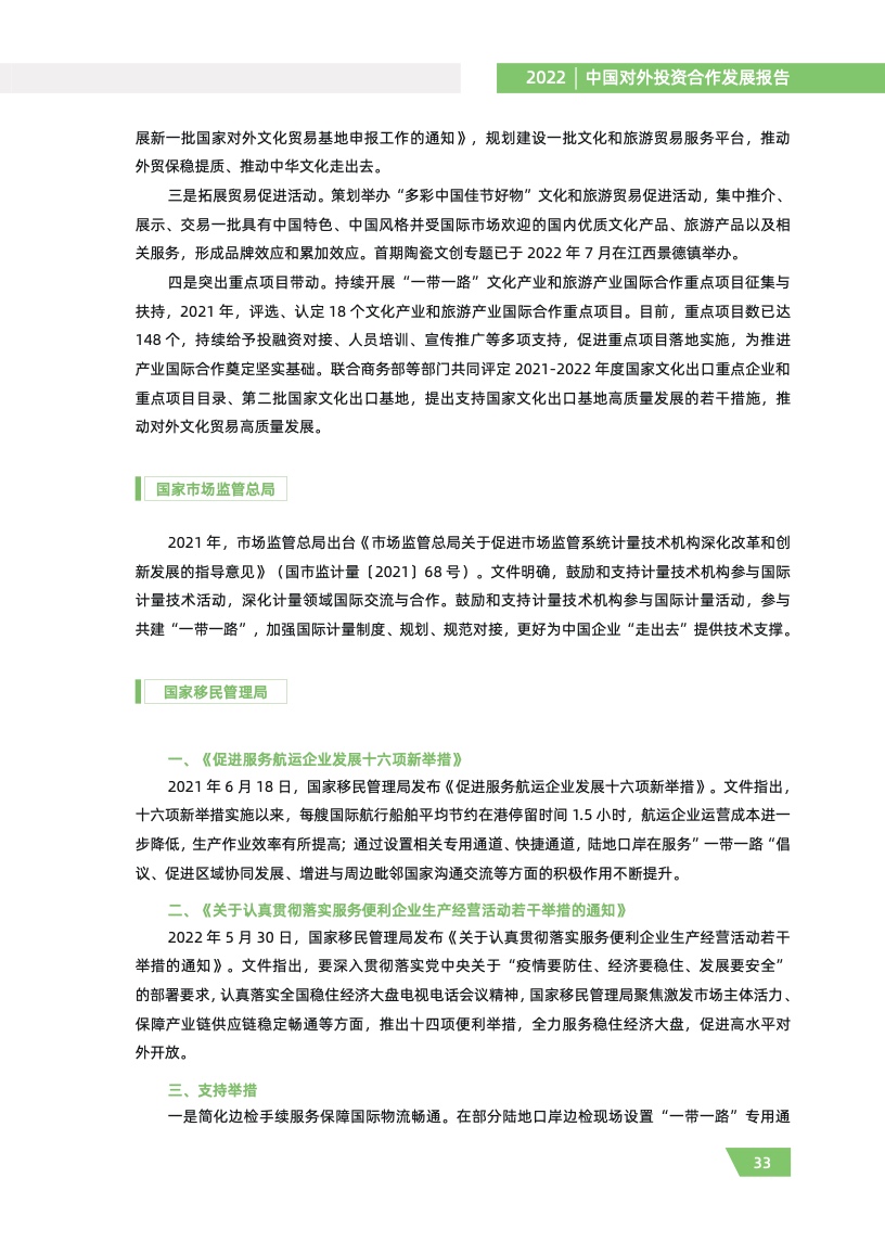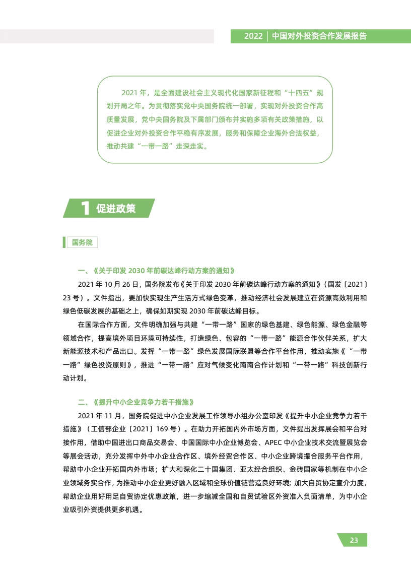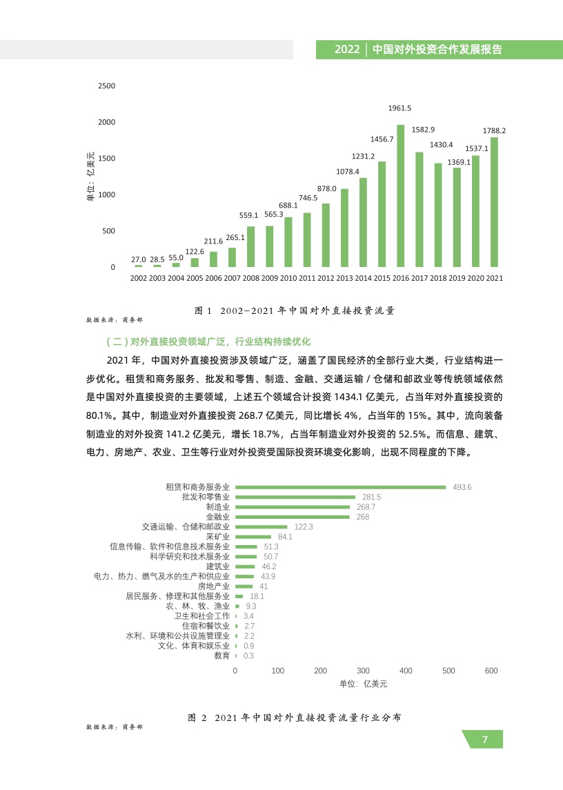 一是对外投资稳中有进。2021 年,我国对外全行业直接投资 1788.2 亿美元,同比增长 16.3%,连续十年位列全球对外直接投资流量前三,连续六年占全球份额超过一成。其中对外非金融 类直接投资 1520.2 亿美元,同比增长 13.4%,稳居世界前列。截至 2021 年末,纳入商务部统计的 境外经贸合作区分布在 46 个国家,累计投资 507 亿美元,上缴东道国税费 66 亿美元,为当地创造 就业岗位 39.2 万个,有力促进了互利共赢、共同发展。埃及苏伊士经贸合作区、泰中罗勇工业园等合作效果好、辐射效应大。