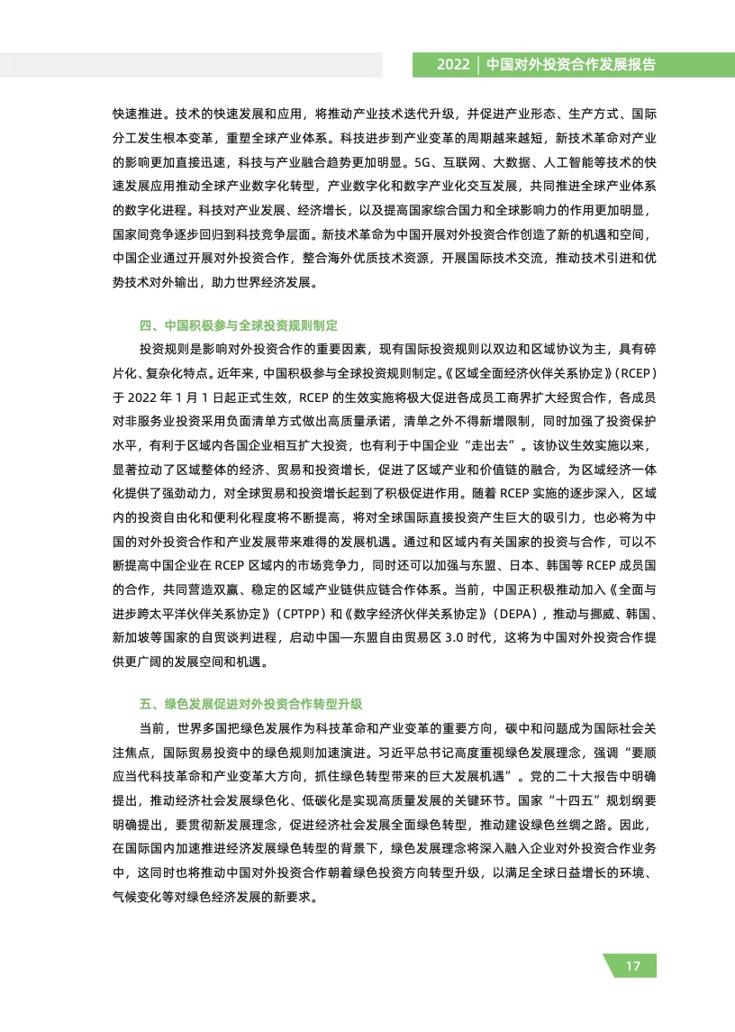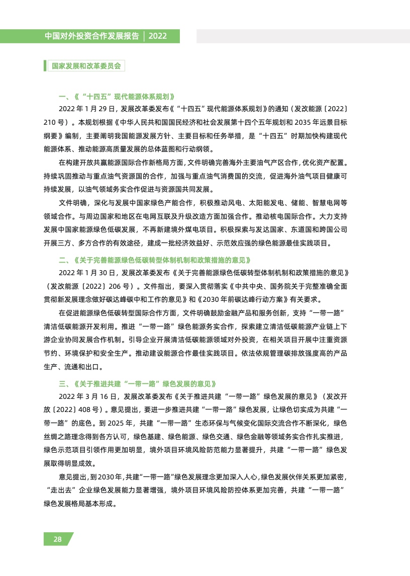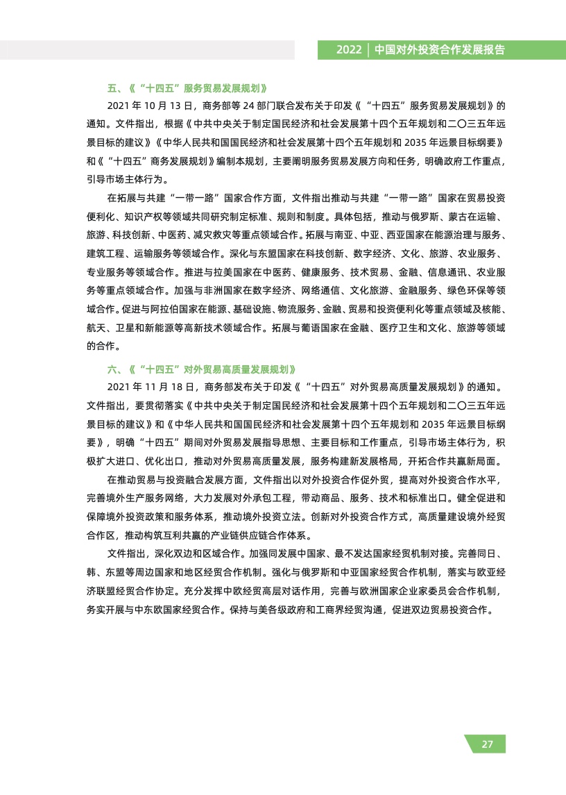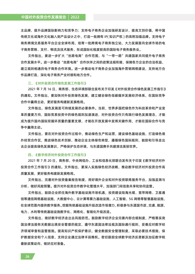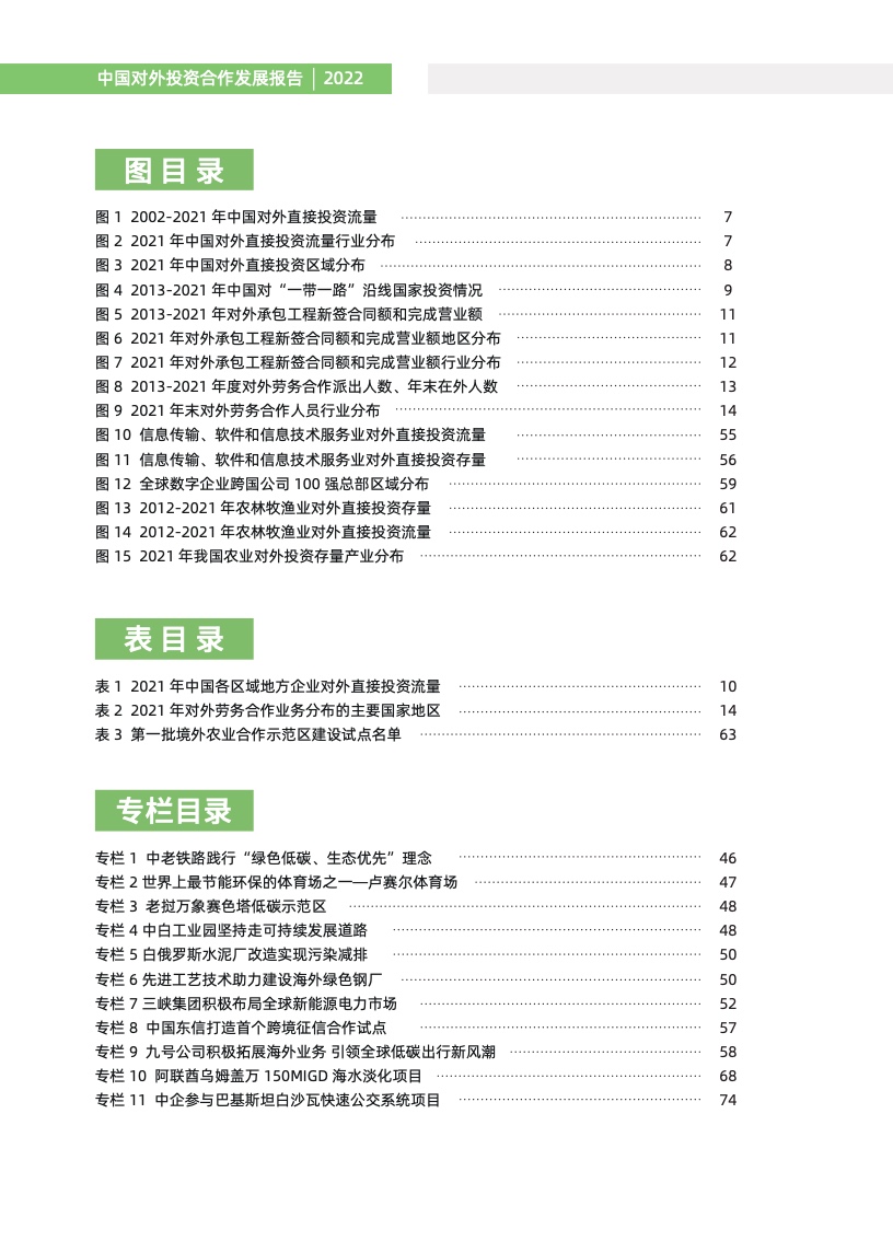 一是对外投资稳中有进。2021 年,我国对外全行业直接投资 1788.2 亿美元,同比增长 16.3%,连续十年位列全球对外直接投资流量前三,连续六年占全球份额超过一成。其中对外非金融 类直接投资 1520.2 亿美元,同比增长 13.4%,稳居世界前列。截至 2021 年末,纳入商务部统计的 境外经贸合作区分布在 46 个国家,累计投资 507 亿美元,上缴东道国税费 66 亿美元,为当地创造 就业岗位 39.2 万个,有力促进了互利共赢、共同发展。埃及苏伊士经贸合作区、泰中罗勇工业园等合作效果好、辐射效应大。