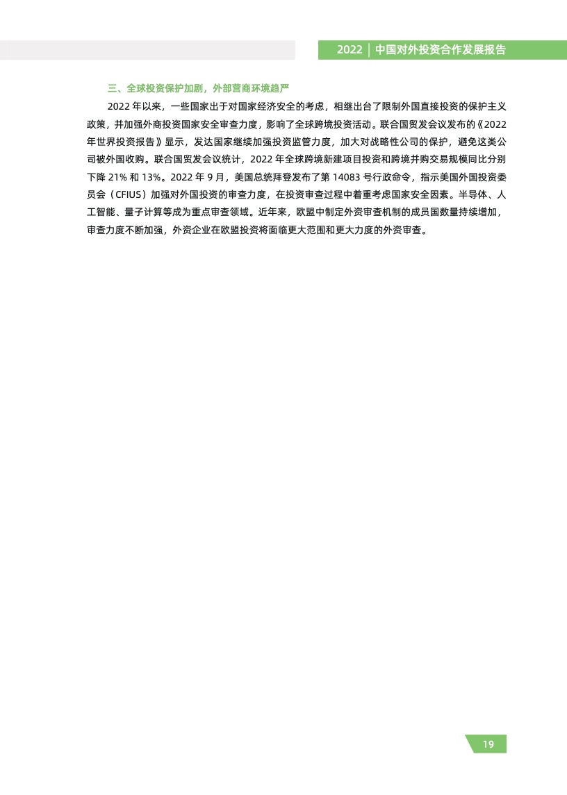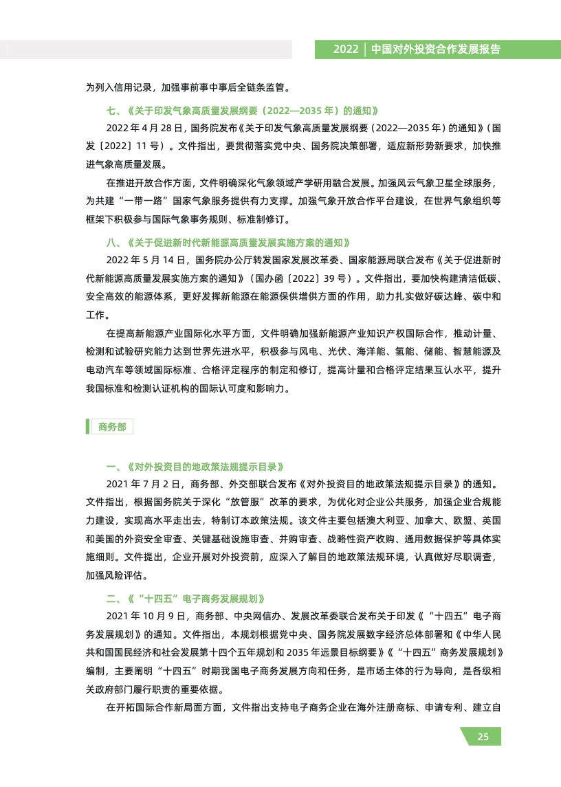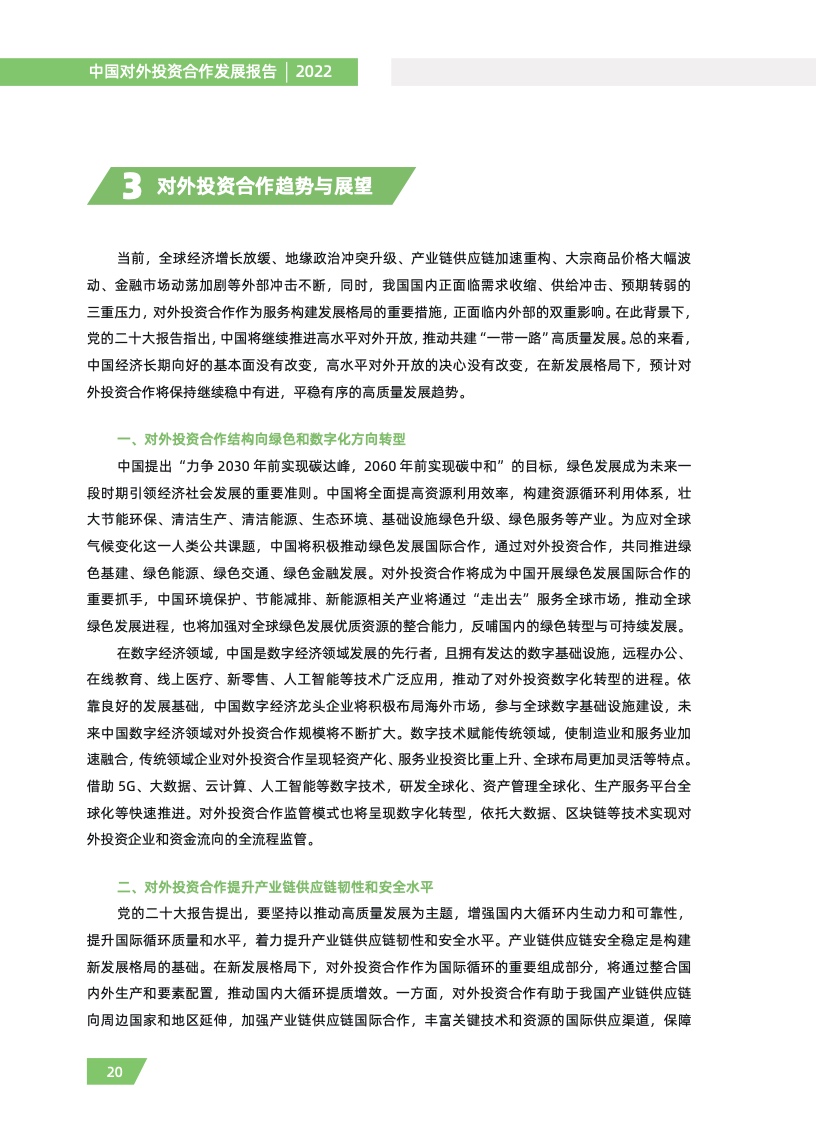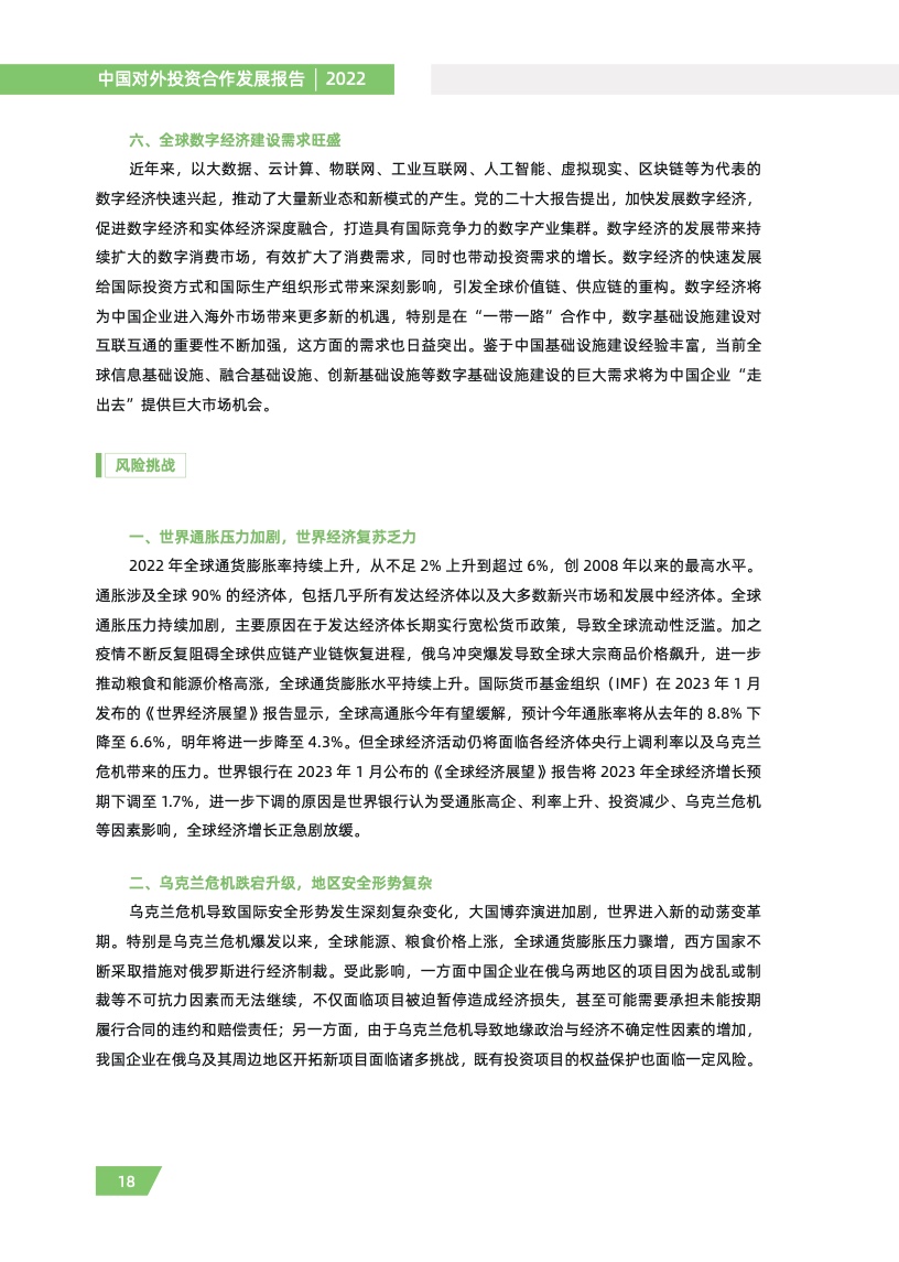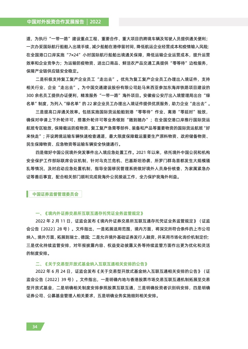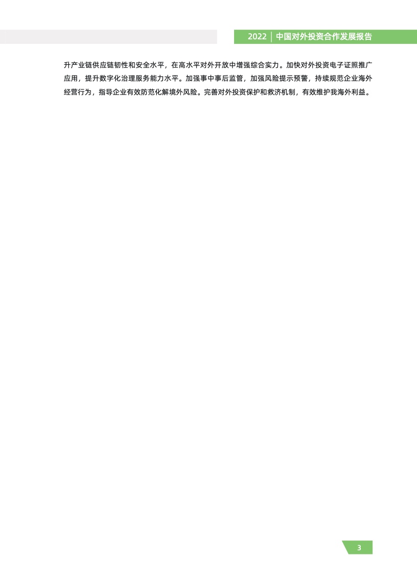 一是对外投资稳中有进。2021 年,我国对外全行业直接投资 1788.2 亿美元,同比增长 16.3%,连续十年位列全球对外直接投资流量前三,连续六年占全球份额超过一成。其中对外非金融 类直接投资 1520.2 亿美元,同比增长 13.4%,稳居世界前列。截至 2021 年末,纳入商务部统计的 境外经贸合作区分布在 46 个国家,累计投资 507 亿美元,上缴东道国税费 66 亿美元,为当地创造 就业岗位 39.2 万个,有力促进了互利共赢、共同发展。埃及苏伊士经贸合作区、泰中罗勇工业园等合作效果好、辐射效应大。