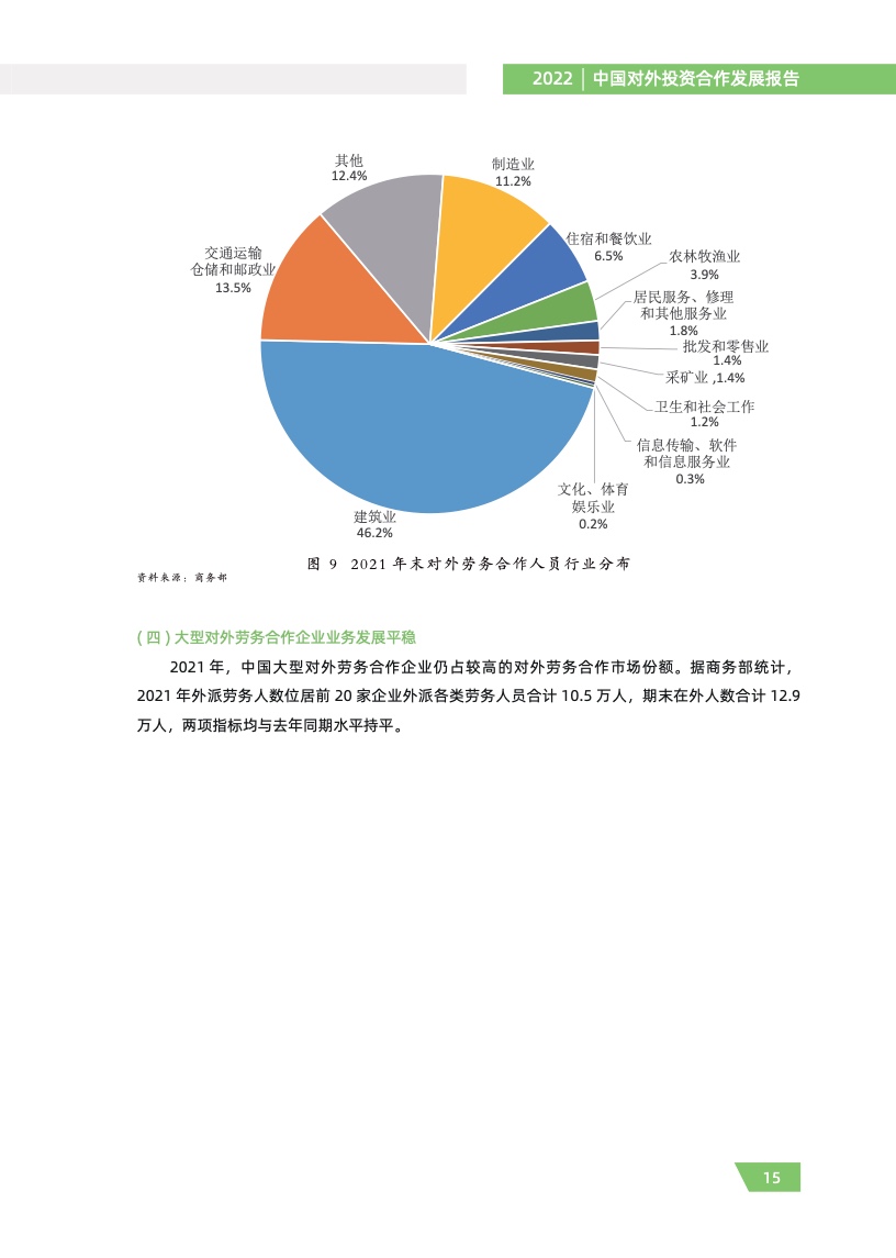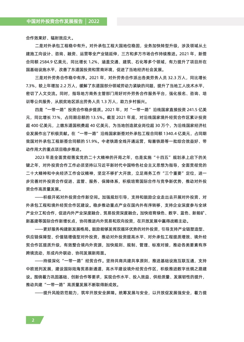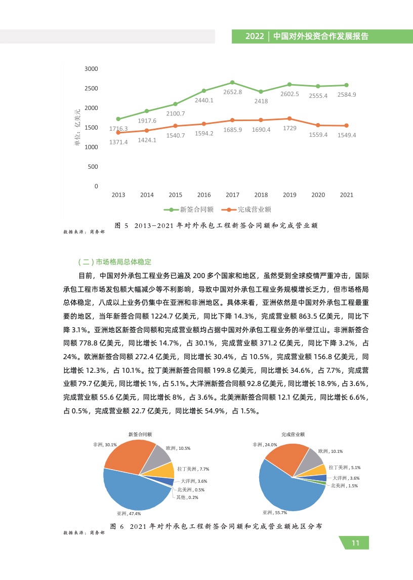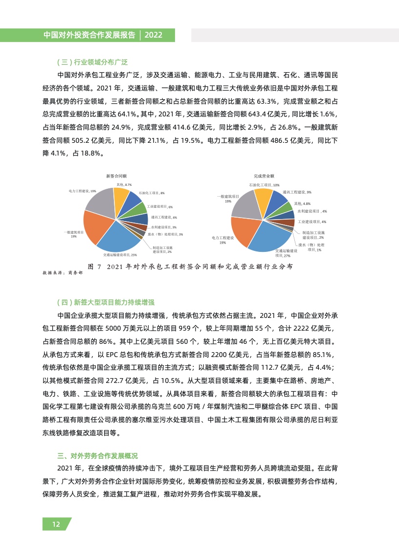 二是对外承包工程稳中有升。对外承包工程大国地位稳固,业务加快转型升级,涉及领域从土 建施工向设计、咨询、融资、运营等全产业链延伸,三方和多方市场合作持续推进。2021 年,新签 合同额 2584.9 亿美元,同比增长 1.2%,涵盖交通、建筑、石化等多个领域,有力提升了项目所在 国基础设施水平,改善了东道国投资和营商环境,促进了当地经济社会发展。