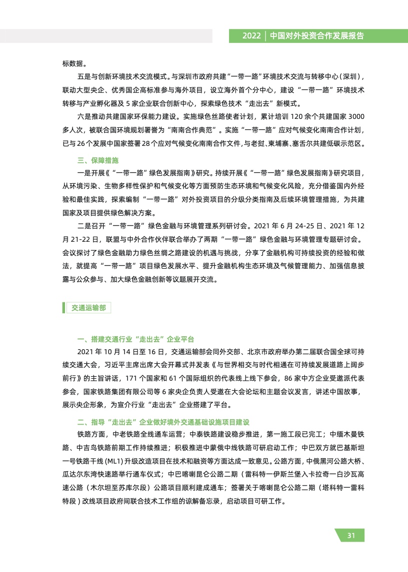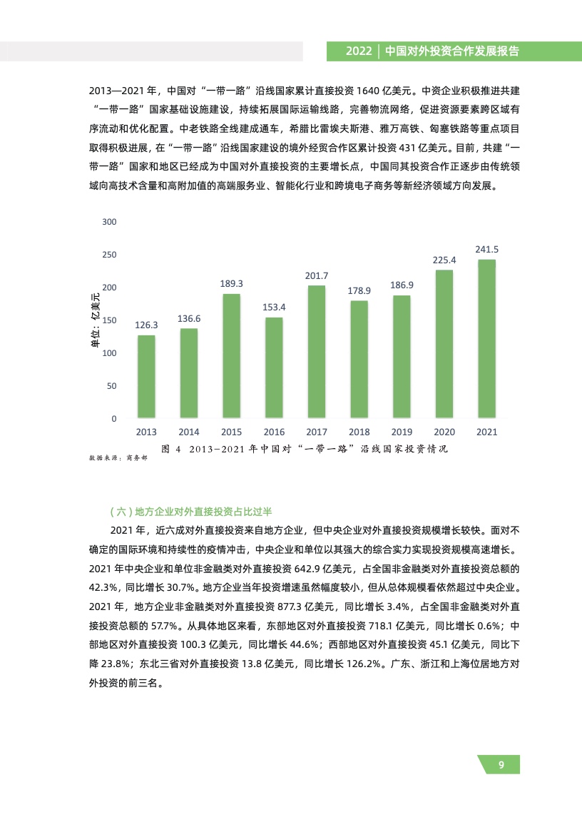 四是“一带一路”投资合作稳步提质。2021 年,对“一带一路”沿线国家直接投资 241.5 亿美 元,同比增长 7.1%,占同期总额的 13.5%。截至 2021 年底,对沿线国家境外经贸合作区累计投资 超 400 亿美元,上缴东道国税费超 40 亿美元,为当地创造就业岗位超 30 万个,为沿线国家经济社 会发展作出了积极贡献。在“一带一路”沿线国家新签对外承包工程合同额 1340.4 亿美元,占同期 我国对外承包工程新签合同额的 51.9%。中老铁路全线开通运营,匈塞铁路等一批综合效益好、带 动作用大的重点项目稳步推进。