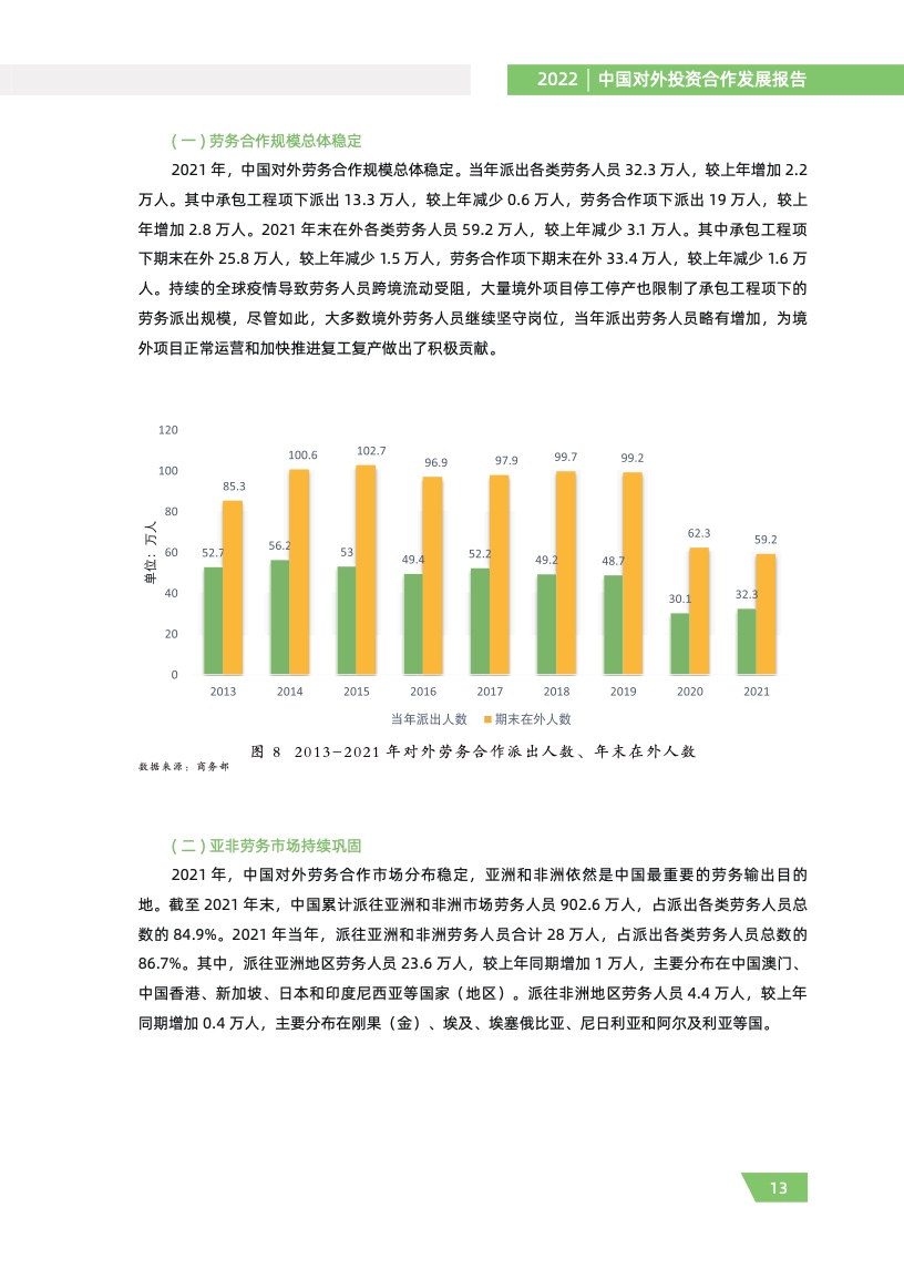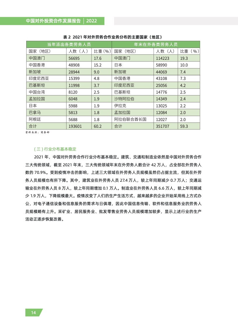三是对外劳务合作稳中有序。2021 年,对外劳务合作派出各类劳务人员 32.3 万人,同比增长 7.3%,较上年增加 2.2 万人,缓解了东道国部分领域劳动力紧缺的问题,提升了当地工人技术水平, 密切了人文交流。同时,指导地方商务主管部门用好对外劳务合作服务平台,强化报名、咨询、培 训等公共服务,从脱贫地区派出劳务人员 1.3 万人,助力乡村振兴。