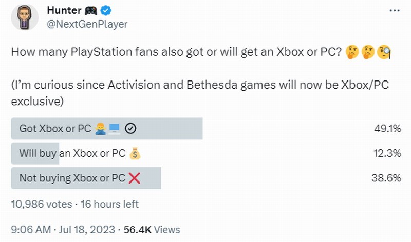 游戏博主Hunter在推特上发起一项投票活动,调查有多少PlayStation玩家同时拥有Xbox或PC。据统计数据显示,有49.1%的PlayStation玩家同时拥有Xbox或PC,12.3%玩家表示会买Xbox或PC,38.6%玩家没有购买Xbox或PC。