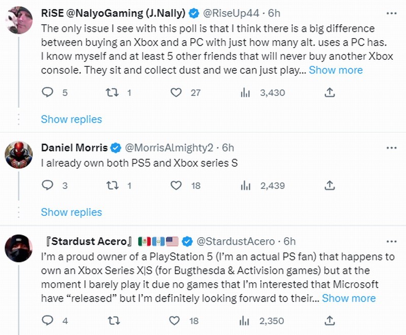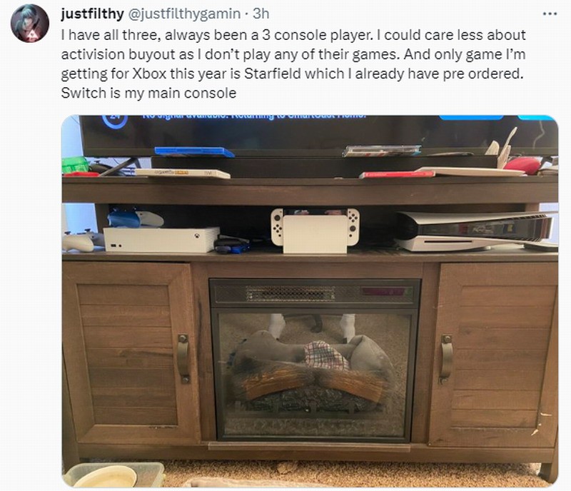 也有位网友表示他三个主机都有,并且不关心动视被收购,因为不玩他们的任何游戏。今年唯一要买的Xbox游戏是《星空》,他最喜欢玩的还是Switch。