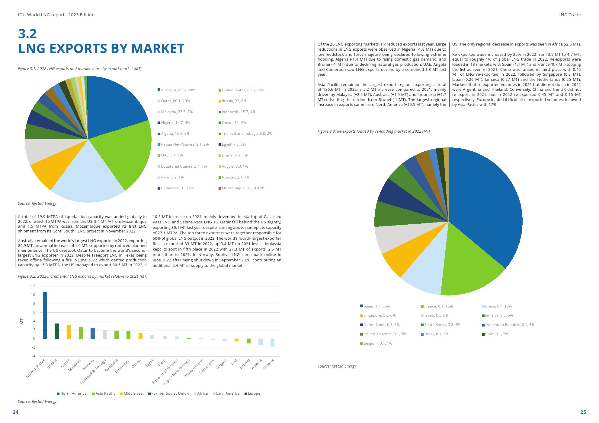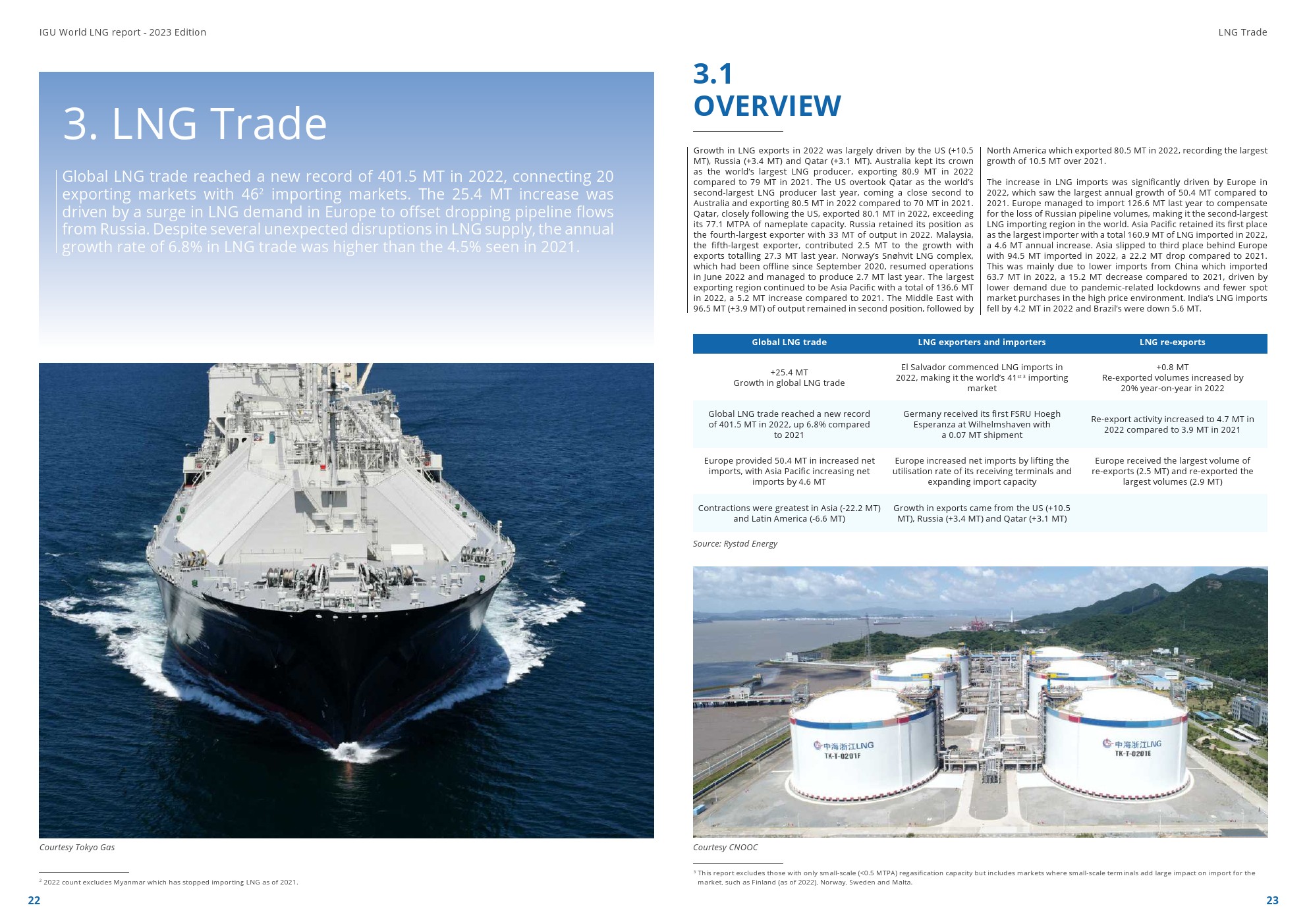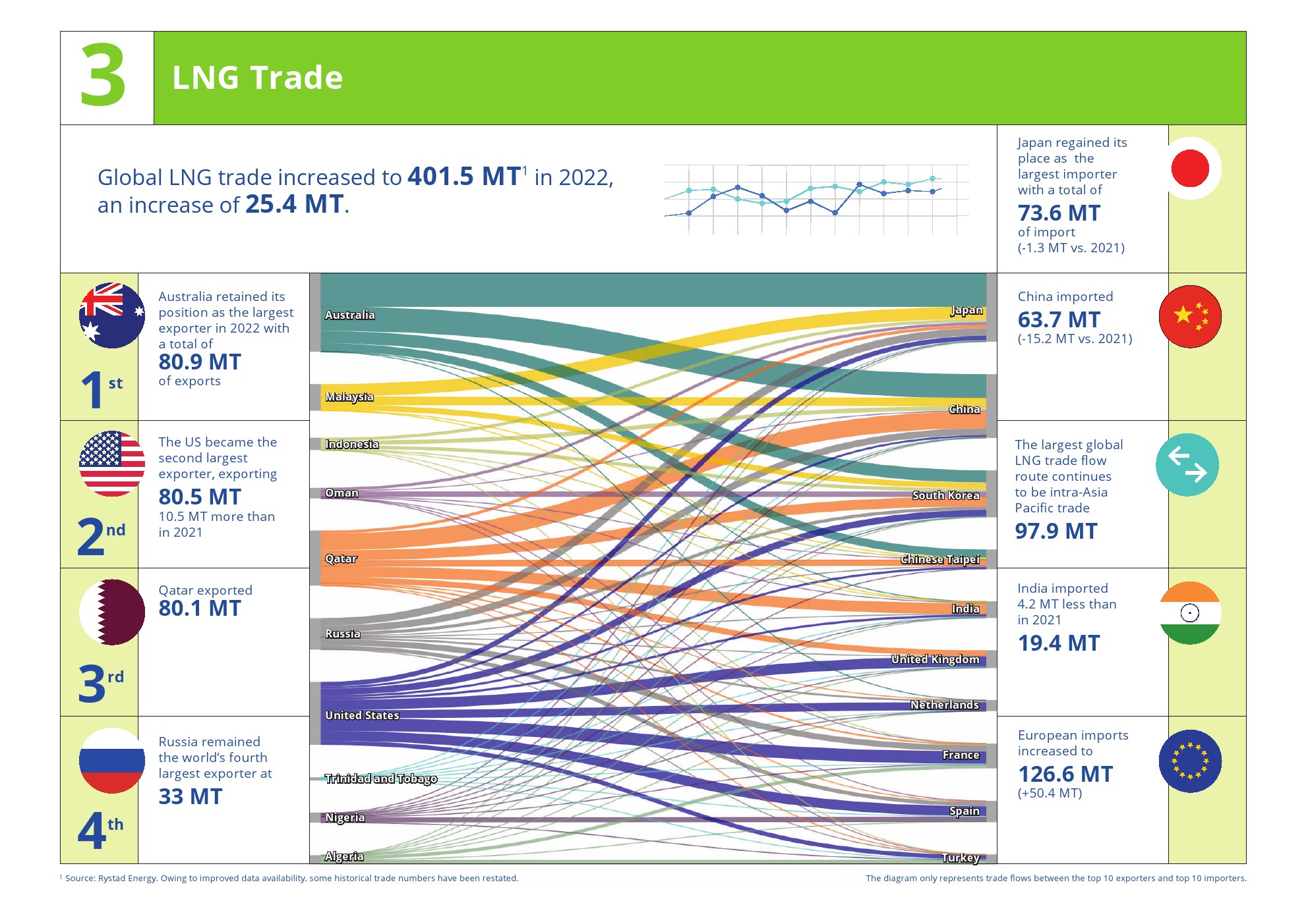 2022年,全球液化天然气贸易量达到401.5吨的新纪录,将20个出口市场与462个进口市场连接起来。2540万吨的增长是由欧洲液化天然气需求激增推动的,以抵消俄罗斯管道流量的下降。尽管液化天然气供应出现了几次意外中断,但液化天然气贸易的年增长率为6.8%,高于2021年的4.5%。