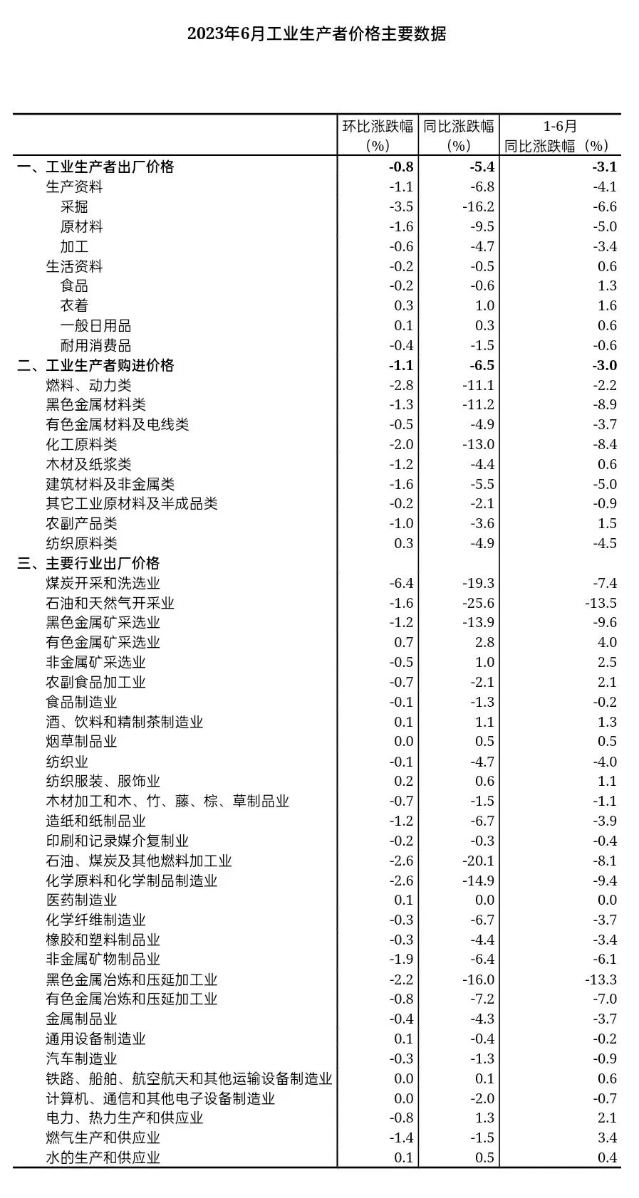 2023年6月份,全国工业生产者出厂价格同比下降5.4%,环比下降0.8%;工业生产者购进价格同比下降6.5%,环比下降1.1%。上半年,工业生产者出厂价格比上年同期下降3.1%,工业生产者购进价格下降3.0%。