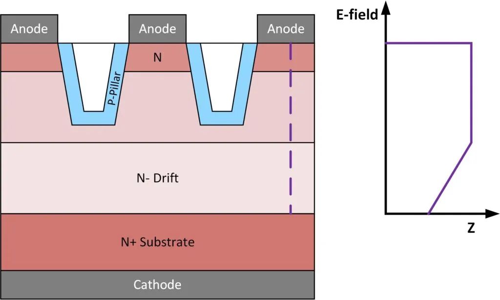 图1:采用沟槽刻蚀和侧壁注入形成具有电荷平衡柱的SiC二极管