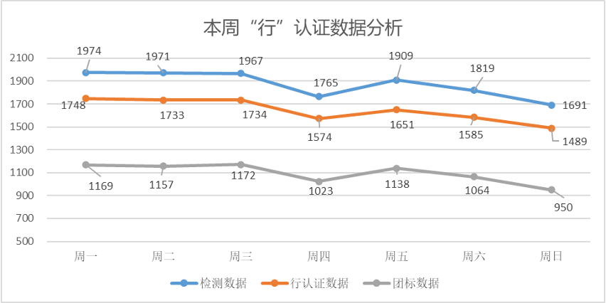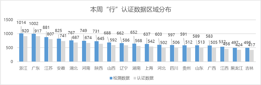 2023年6月底及7月初这一周,上报 “行”认证统计数据中基于国家标准检测车辆为13096台,提报数较上周增加约7%,其中,符合“行”认证标准的11514台占比约为88%,符合团标的7672占比58%,整体车况质量较上周略微提升。