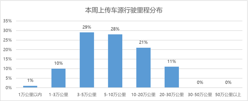 从上传车源行驶里程数据来看,本周上传数据中,5万公里以内的“较新车”数据较与上周持平,5-10万公里的“性价比”车源数据较上周增加1%, 10万公里以上的车源数据降低了1%。