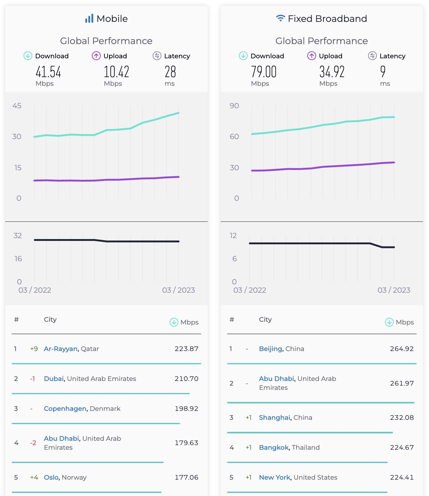 Ookla报告还揭示了个别城市的互联网性能,其中北京的固定宽带中位速度最快,为264.92Mbps,延迟为9ms,卡塔尔的Ar-Rayyan以223.87Mbps和18ms的延迟领先于移动宽带。