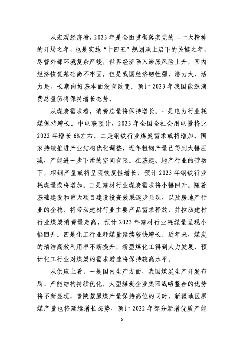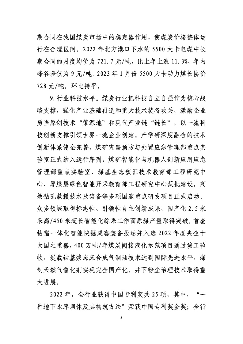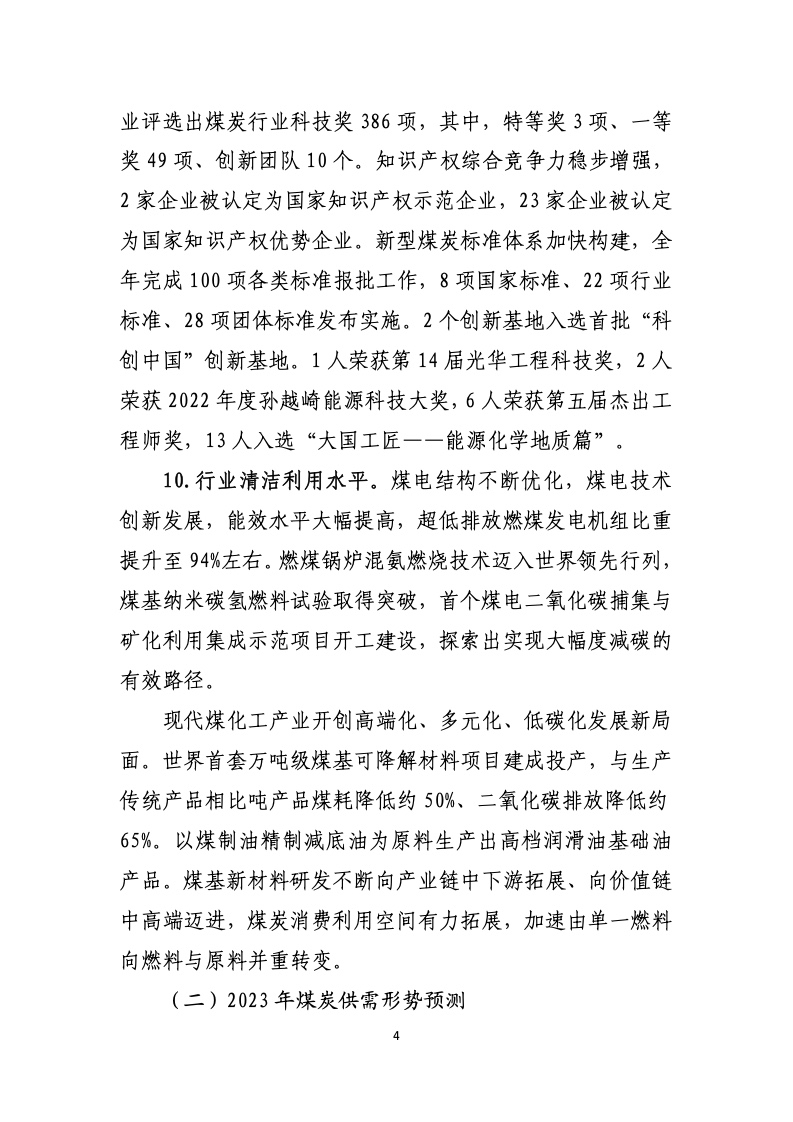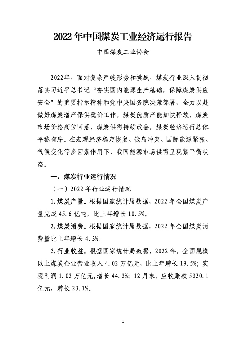 中国煤炭工业协会:2022年中国煤炭工业经济运行报告 煤炭产量:根据国家统计局数据,2022 年全国煤炭产量完成 45.6 亿吨,比上年增长10.5%。 煤炭消费:根据国家统计局数据,2022 年全国煤炭消费量比上年增长 4.3%。 行业收益:根据国家统计局数据,2022 年,全国规模以上煤炭企业营业收入 4.02 万亿元,比上年增长19.5%;实现利润 1.02 万亿元,增长 44.3%;12 月末,应收账款5320.1亿元,增长 23.1%。 更多阅读:中国煤炭工业协会:2020年中国煤炭工业经济运行报告中国煤炭工业协会:2023年煤炭行业经济运行报告IEA:2024年煤炭报告IEA:2023年煤炭报告IEA:2021年煤炭报告预计2030年美国塑料行业污染将超过煤炭国际能源署:2024年全球煤炭需求将达87.7亿吨创新高消费者品牌报告:寻找真相Demand Gen :制造商将数字转换扩展到销售和营销报告K-12报告:2017-2018全球数字学习现状Salesforce:2021年联网消费者报告中国化学制药工业协会:2023年化学制药行业经济运行报告中国人民银行:山西省金融运行报告(2022)联合国:2022年全球经济前景报告中国人民银行:湖北省金融运行报告(2021)