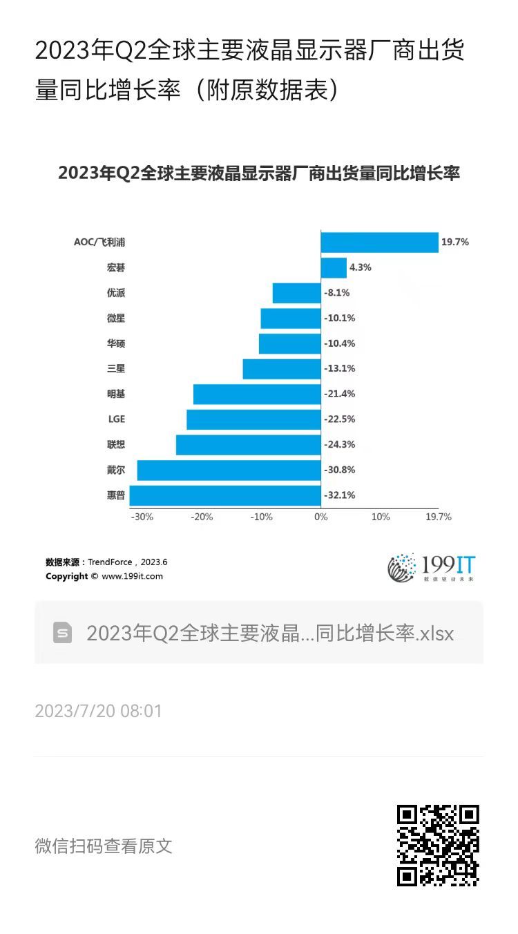 - 2023年Q2全球主要液晶显示器厂商出货量环比增长率(附原数据表)