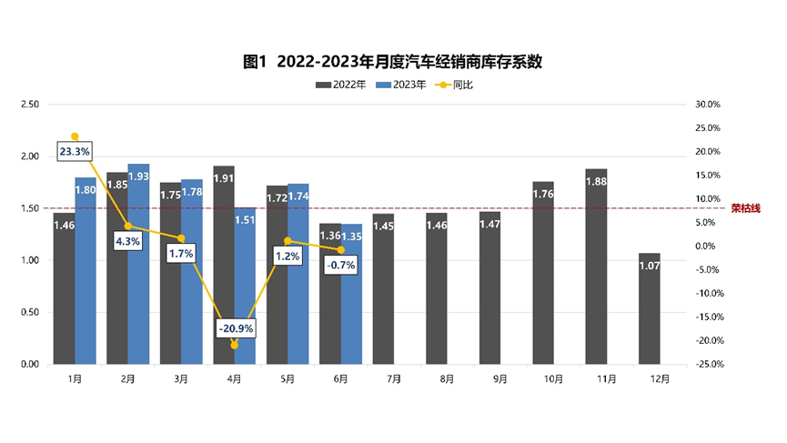 2023年7月10日,中国汽车流通协会发布2023年6月份“汽车经销商库存”调查结果:6月份汽车经销商综合库存系数为1.35,环比下降22.4%,同比下降0.7%,库存水平在警戒线以下。