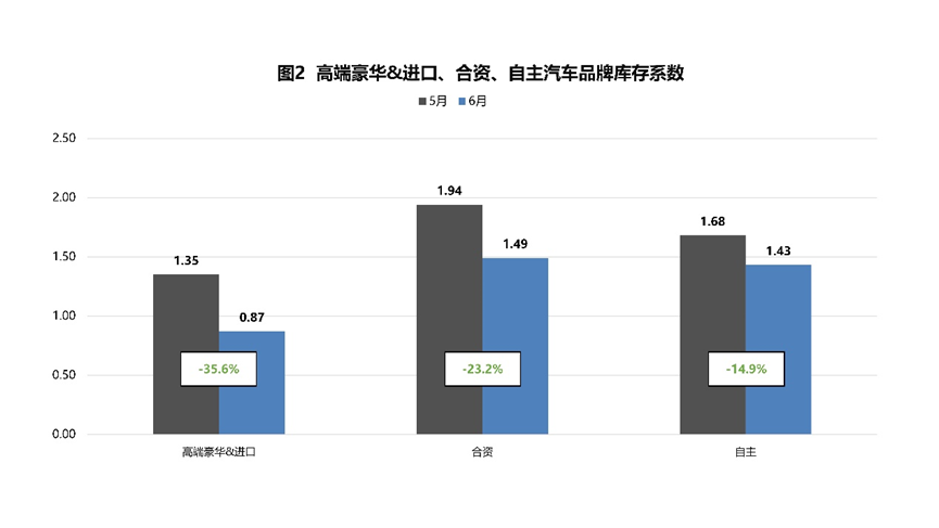 高端豪华&进口品牌库存系数为0.87,环比下降35.6%;合资品牌库存系数为1.49,环比下降23.2%;自主品牌库存系数为1.43,环比下降14.9%。