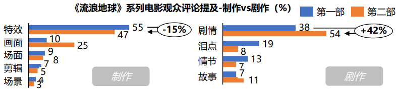 2023年年初,在防疫政策优化的大背景下,线下流动性逐渐增强,消费者走出家门,观影行为得到一定的恢复。作为放开之后的第一个重要档期,2023年春节电影票房(68亿)较上年表现较好,且票房总数高于2019年疫前水平(59亿)。同时,其马太效应依然明显,头部电影牢牢占据票房和舆论焦点:《满江红》与《流浪地球2》票房共占据春节档超七成,共提微博热搜23次。高口碑或高知名度的经典IP系列电影占据消费者认知,因此更容易被消费者所选择,如《流浪地球》系列、《熊出没》系列在我国国产片影史中都在系列电影票房前五占有位置,其续作分别位列春节档第2以及第3。而在高票房与舆论热度的背后,观众对于系列内容的质量依然抱有较高期待,相比前作,即使是硬核科幻题材的《流浪地球》系列,对于剧作的关注度提升超过了制作,系列电影的剧情发展受到观众的高度在意。