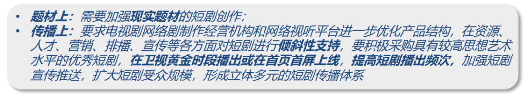 2022年底,广电总局颁布了《关于推动短剧创作繁荣发展的意见》,其中明确提出了短剧的定义为“单集时长15—30分钟的系列剧、集数在6集内的系列单元剧、20集内的连续剧、周播剧等多种形态”,并提出以下多点后续发展方向的要求,囊括了从内容来源到宣发以及后续评论与管理主体的整个生命周期流程,尤其强调了在题材上和传播上做出了明确的规定。