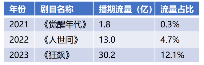 现实主义题材剧目由于其天然贴近生活细节、关联社会痛点的特征使观众便于理解,因此更能够通过剧中人物所表现的精神在观众脑海中得到一定的映射,从而引起观众共鸣。自2021年的《觉醒年代》,到2022年的《人世间》,再到2023年的《狂飙》,现实主义题材都拥有了良好口碑,叠加它们播出期间都涵盖春节假期,其亲友团聚的传统导致居家场景的属性更为明显,消费者相比平时也拥有更多的空余时间,这些外部因素都为优质剧目内容进化为爆款剧目提供了条件。且从流量角度看,三个剧目的流量及其占比连年上涨,体现消费者对于该类题材的认知与喜好度不断加深。