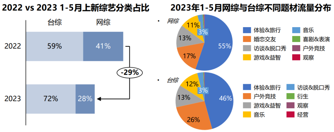 综艺市场整体供应有所缩减,分综艺类型看,2023上半年台综输出较为稳定,但网综供应数目同比减少较为明显。从两者的题材流量分布看也有所不同,体验与旅行类占绝对大流,从Top2-Top4的题材看,受制作端影响,相对而言台综偏向传统审美的户外竞技与音乐,而网综则更擅长于贴近生活的婚恋交友与访谈&脱口秀。