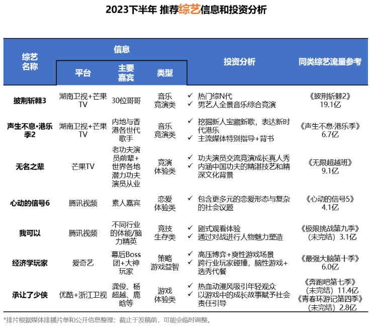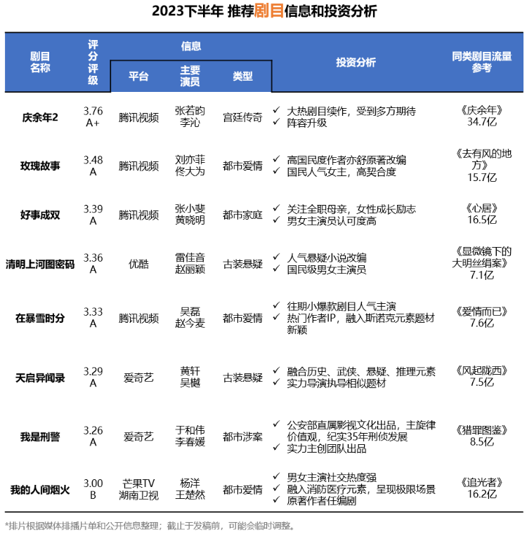 2023年是重新出发的一年,随着疫情管控政策发生改变,国内大环境有所回暖,线下场景回归。广电总局对长视频内容的监管整体态势平稳,消费者在内容的偏好整体趋势有所延续,平台也继续探索新的内容变现模式。本周的媒介直通车将为您推荐2023年下半年优质剧综资源,把握风向、踩准节奏,帮助提高投资效率和效果。