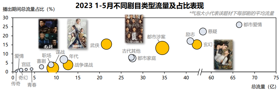 分题材类型看,2023年上半年高流量依旧集中在都市、悬疑、古装(玄幻、武侠)等相关题材。其中悬疑题材整体占比与流量较高,由多部剧集贡献而成,呈现小而精的格局;都市爱情也属于多数量高流量的题材,除去具体背景不同以外,其中最高流量占比的剧目多数包含流量明星,但由于时代背景贴合以及场景的多样化,为营销植入提供了更合适的条 件,因此投资收益与风险并存;谍战与涉案类型的剧目由于主旋律价值观及其剧情波折带来的观看体验,因而存在安全且较好的优质内容产出能力;玄幻与武侠类型热门剧则依靠演员自身号召力与IP改编吸引不同圈层的观众,但上半年存在部分剧目临时下架的情况,投资时依然需要注意内容风险。