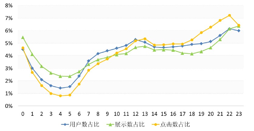 1、每天18:00-24:00用户最为活跃,同时手机广告投放量较多,用户点击数高峰出现在22:00,点击率高峰出现在20:00。从每天12:00开始到23:00,点击数占比均能超过用户数占比和展示数占比。