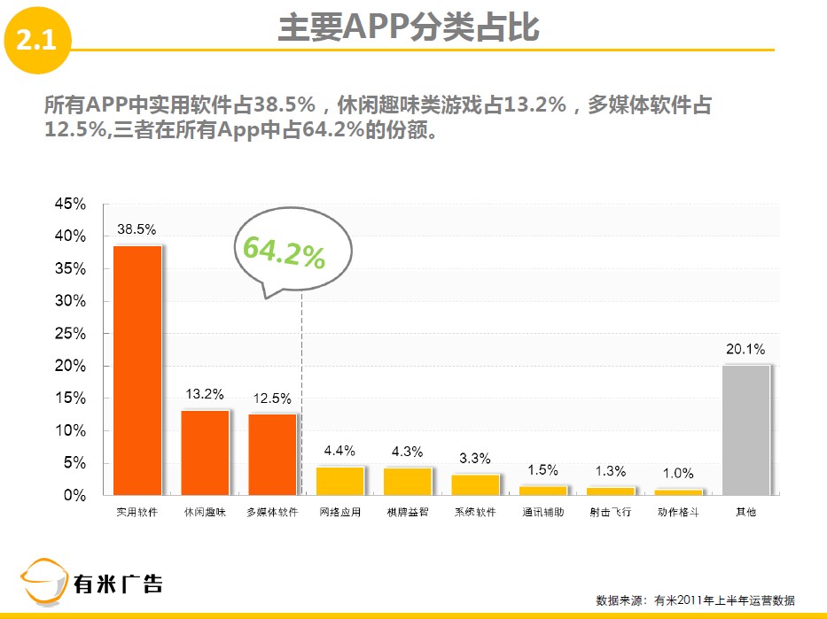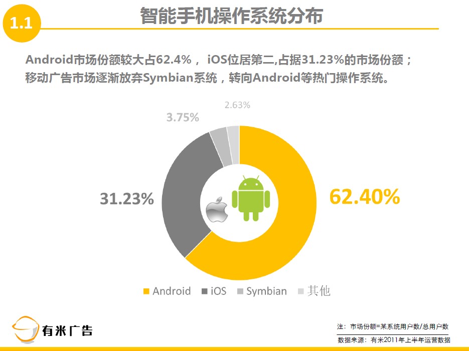 2011上半年有米广告凭借着优质的服务和务实的精神深受广告主和开发者喜爱,为了让更多的广告主和开发者加入并持续信任有米移动广告平台,我们决定推出有米广告2011上半年数据报告。该数据报告将贯穿于系统终端、APP、用户行为、广告投放,条理分明地阐述着国内手机广告平台的发展趋势。