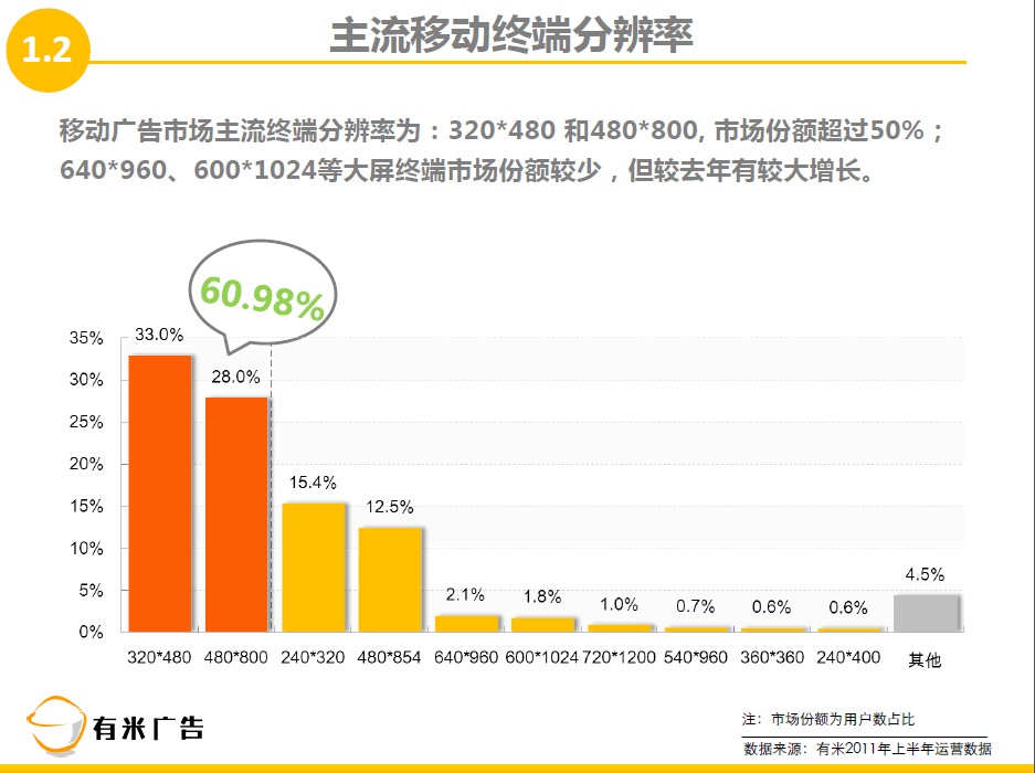 2、 手机广告市场主流终端分辨率为:320*480和480*800,占有率高达60.98%,而配置640*960和600*1024分辨率的大屏终端预测将持续增长。随着平板设备的热销,越来越多的APP开发者正努力让更多应用在平板设备中运行。