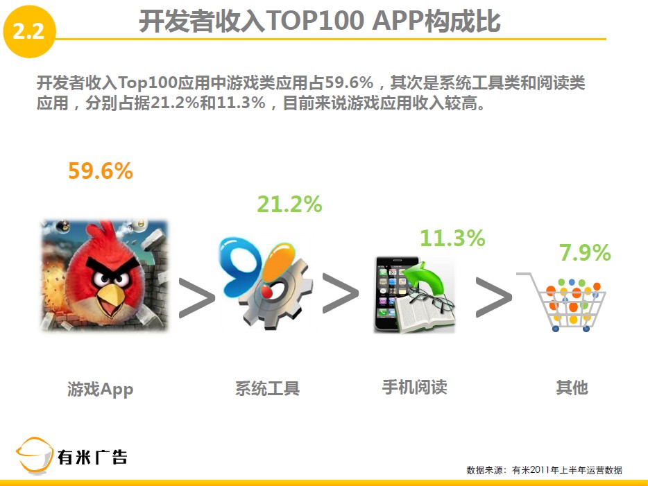 1、实用软件、游戏为目前手机广告市场的主要媒介,在开发者收入Top100 APP中,游戏占59.6%;相对于游戏的天然优势,手机阅读应用凭借着强烈的用户需求占11.3%,实为不可忽视的一块大蛋糕。