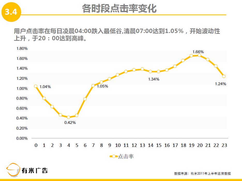 2、用户点击率在每天凌晨04:00跌入最低谷,仅为0.42%,清晨07:00达到1.05%,并开始波动性上升。点击率高峰分别出现在13:00和20:00,其中20:00达到1.66%,可见用户在休息时间更乐意点击手机广告。