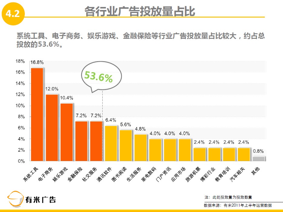 1、系统工具、电子商务、娱乐游戏、金融保险等行业手机广告投放量占比较大,约占总投放的53.6%,其中电子商务行业的手机广告投放已经成为一种趋势。社交服务行业目前的广告投放只占7.2%,预测年后将会较大幅度增长。