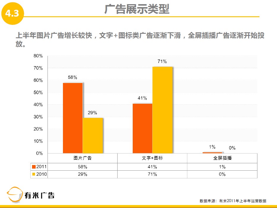 2、有米广告的手机广告展示类型以图片广告和文字+图标广告为主,全屏插播为辅,其中图片广告在上半年实现翻倍的增长,占比已达58%。全屏插播虽仅占据1%份额,但却更受用户的喜爱。