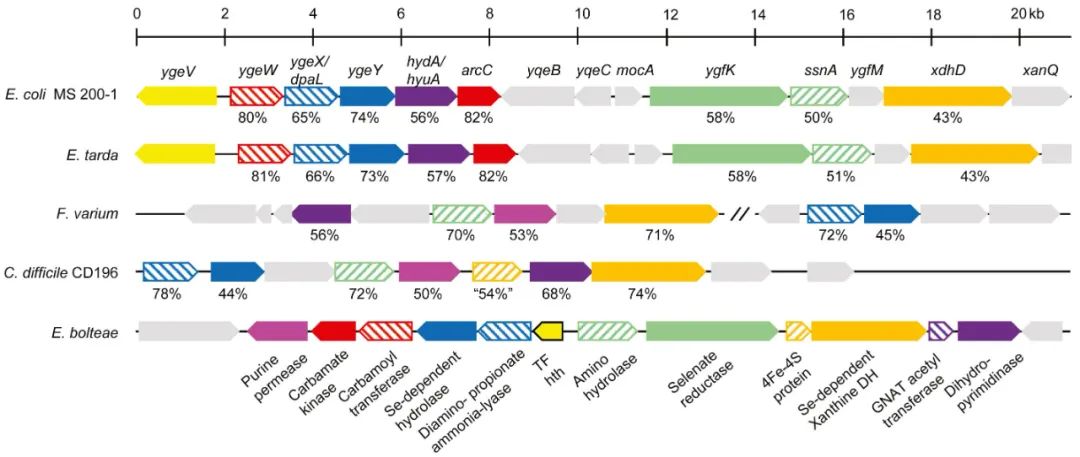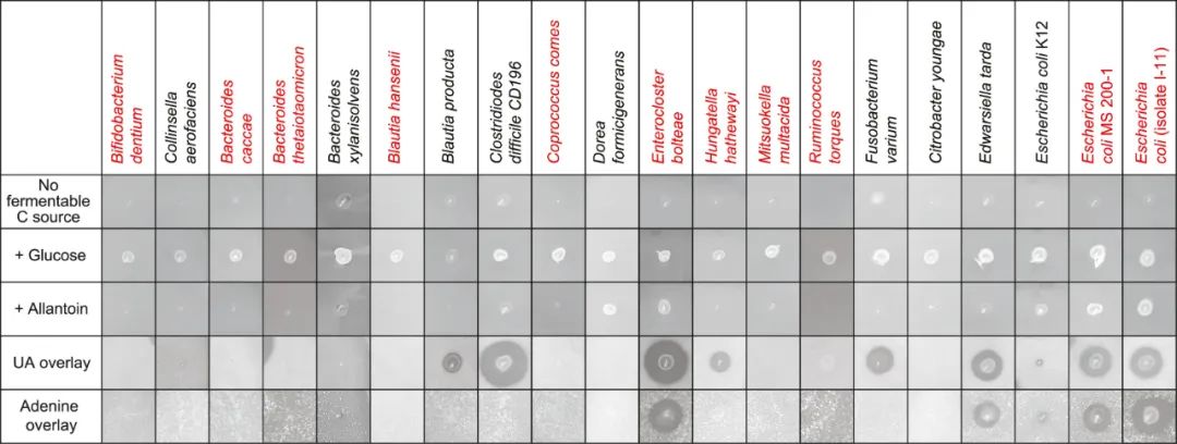 基于这种小规模尝试的成功,研究人员扩大了对具有嘌呤降解能力的肠道微生物的搜索,使用同样的方法,鉴定出了来自6个门的34种细菌,不同菌之间的的嘌呤利用能力不同,例如大肠杆菌MS200-1和I-11相比大肠杆菌K12具有更强的尿酸利用能力;尿囊素能够支持Enterocloster bolteae和大肠杆菌生长,但不能支持艰难梭菌或迟钝爱德华氏菌生长。