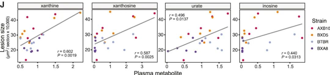 宏基因组分析确定了1649个功能性特征和52个细菌分类特征,相关性分析确定了几种与动脉粥样硬化负荷相关的细菌功能,其中包括与嘌呤的生产和转化有关的功能。小鼠血浆的682种代谢物中,嘌呤代谢物,包括黄嘌呤、黄嘌呤核苷、肌苷和尿酸,与动脉粥样硬化斑块大小呈正相关关系。