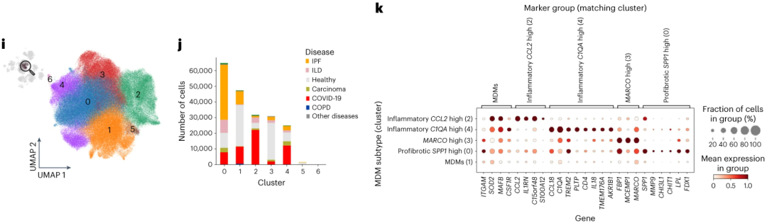 第一种为早期和炎症性MDM(聚类2),高表达CCL2,主要来自COVID-19肺炎患者病程早期的肺泡灌洗液样本,第二种为表达炎症和吞噬作用相关基因的MDM(聚类4),在COVID-19肺炎和肺癌患者中富集,第三种是分化程度更高的MDM(聚类3),主要来自非疾病样本,第四种MDM高表达SPP1、LPL 和CHIT1(聚类0),主要来自IPF样本,同时也在COVID-19病程晚期死亡和COVID-19后发展为肺纤维化,以及肺癌患者样本中富集。