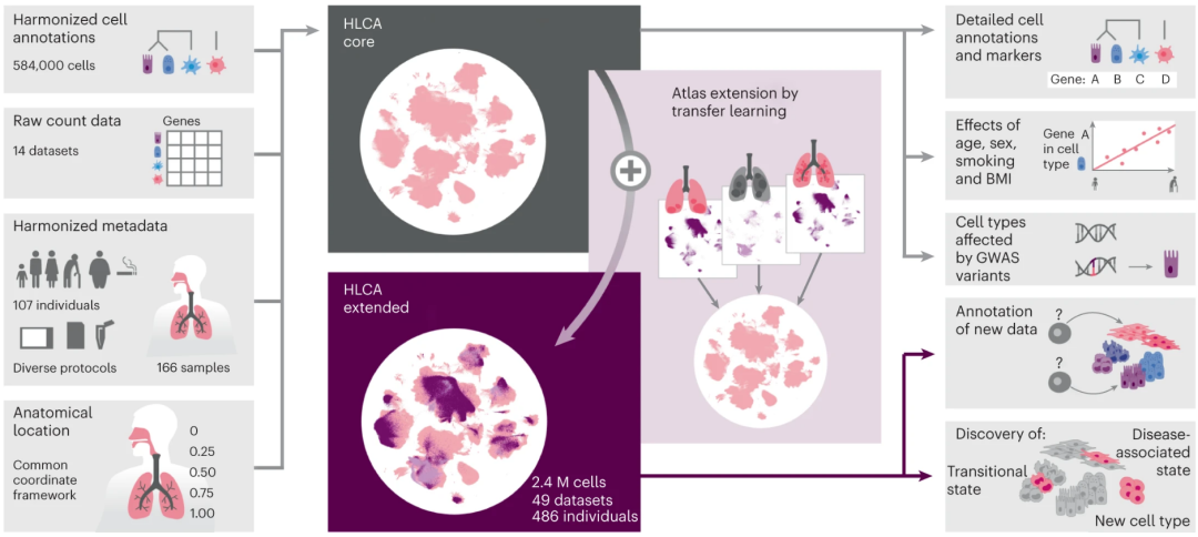 经过整合,研究人员建立了HLCA的核心,在此基础上,再将35个额外的包含疾病样本的数据集映射到HLCA核心,将图谱包含的细胞总数扩展到240万个。