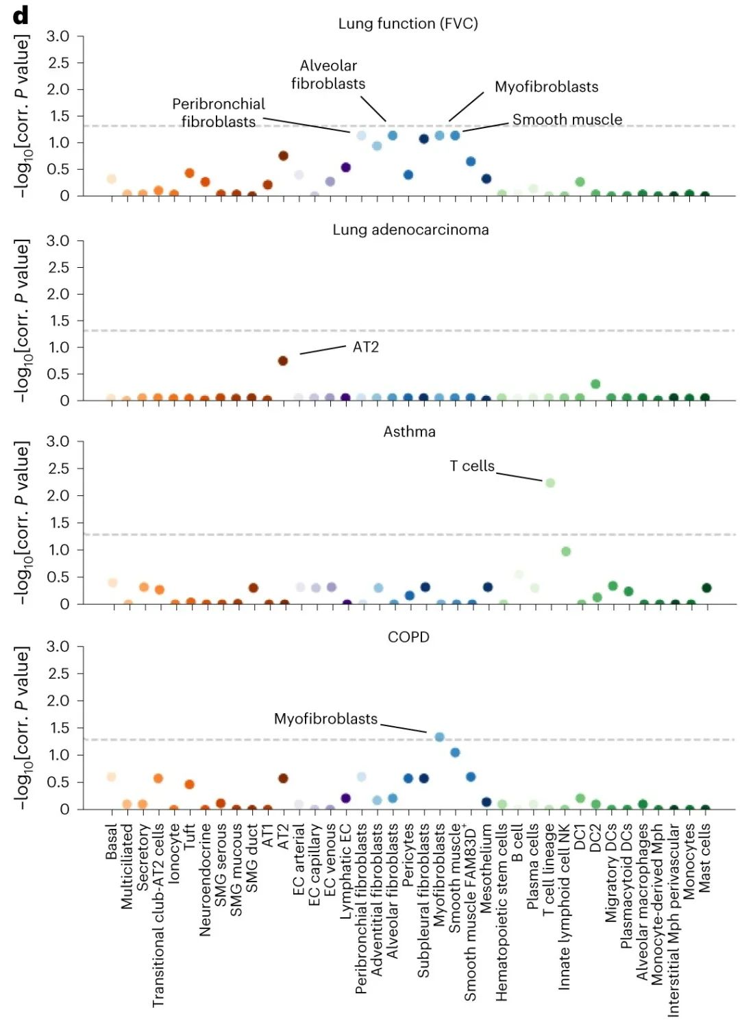 基于先前的GWAS,HLCA细胞类型与四种不同肺部状态的关联