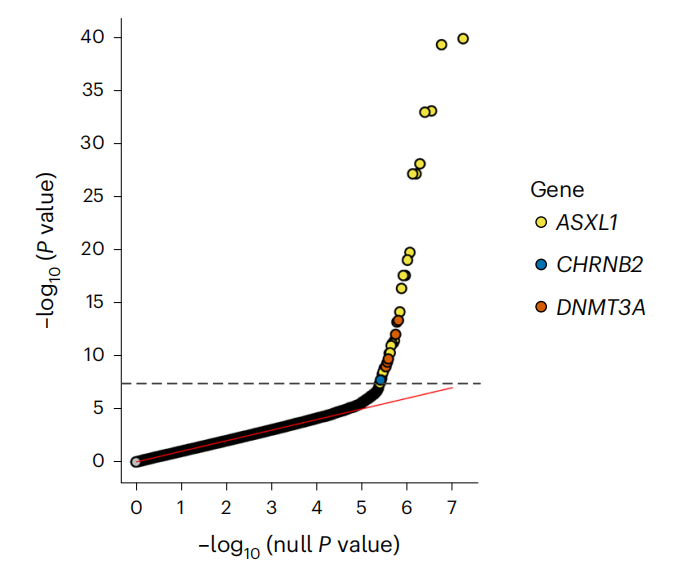 ASXL1和DNMT3A基因与大多数吸烟表型显著相关,并且这些关联与克隆性造血有关。克隆性造血是岁年龄增长而积累的体细胞突变,这表明吸烟可能对这些突变提供了克隆优势。