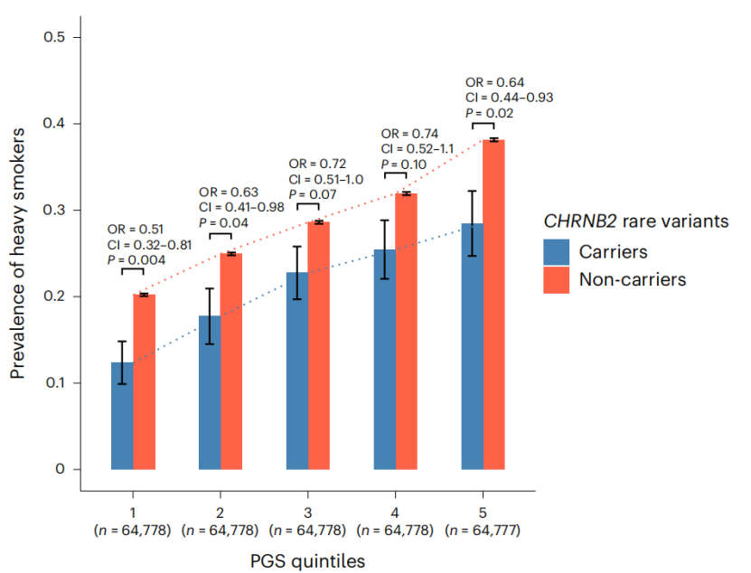 研究人员还讨论了常见突变和罕见突变在吸烟行为中的累加效应。以吸烟多基因得分(PGS)来表示一个人重度吸烟的风险,PGS得分越高越有可能是重度吸烟者。分析结果显示,无论个体是否携带CHRNB2罕见突变,重度吸烟者的患病率都随着PGS得分增加而增加;但是CHRNB2基因的罕见突变对吸烟行为具有保护作用,罕见突变携带者的重度吸烟几率低于非携带者(OR=0.65)。